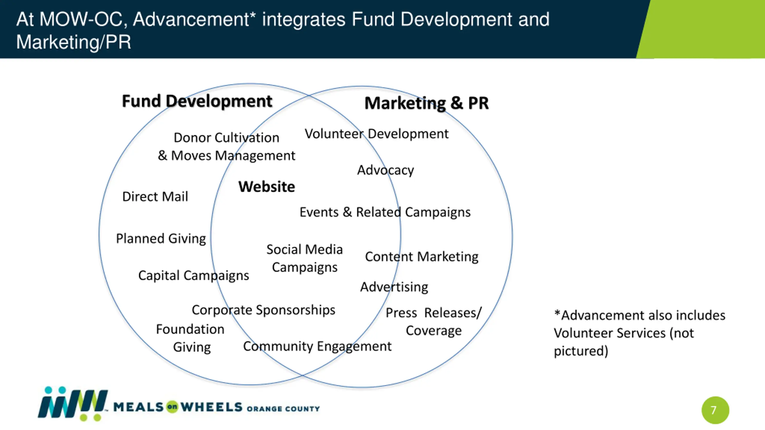 Drill Down on Fund Development: SWOT Assessment Strengths Brand recognition Organization history Corporate & Foundation support Strong Direct mail program Diversified funding streams A physical location and kitchen Strong partnerships and collaborations Individual donor retention rates Weaknesses Lack of digital campaigns Corporate & Foundation relationships can change quickly/easily Limited data on our individual donors & no way to collect wealth data Ability to harness data from database Challenges w/consistent data entry Few leadership/giving societies Strategic/consistent recognition for giving levels Relationships with individual donors Low # of donors giving over $1,000 annually Opportunities Government funding is increasing Elected officials seem to understand need Senior population is only growing age demographic Philanthropy in general is increasing Threats Changes in tax code could impact individual giving Number of nonprofits in OC growing to focus on publicized issues such as homelessness and mental health Philanthropy isn t focused on older adults 6