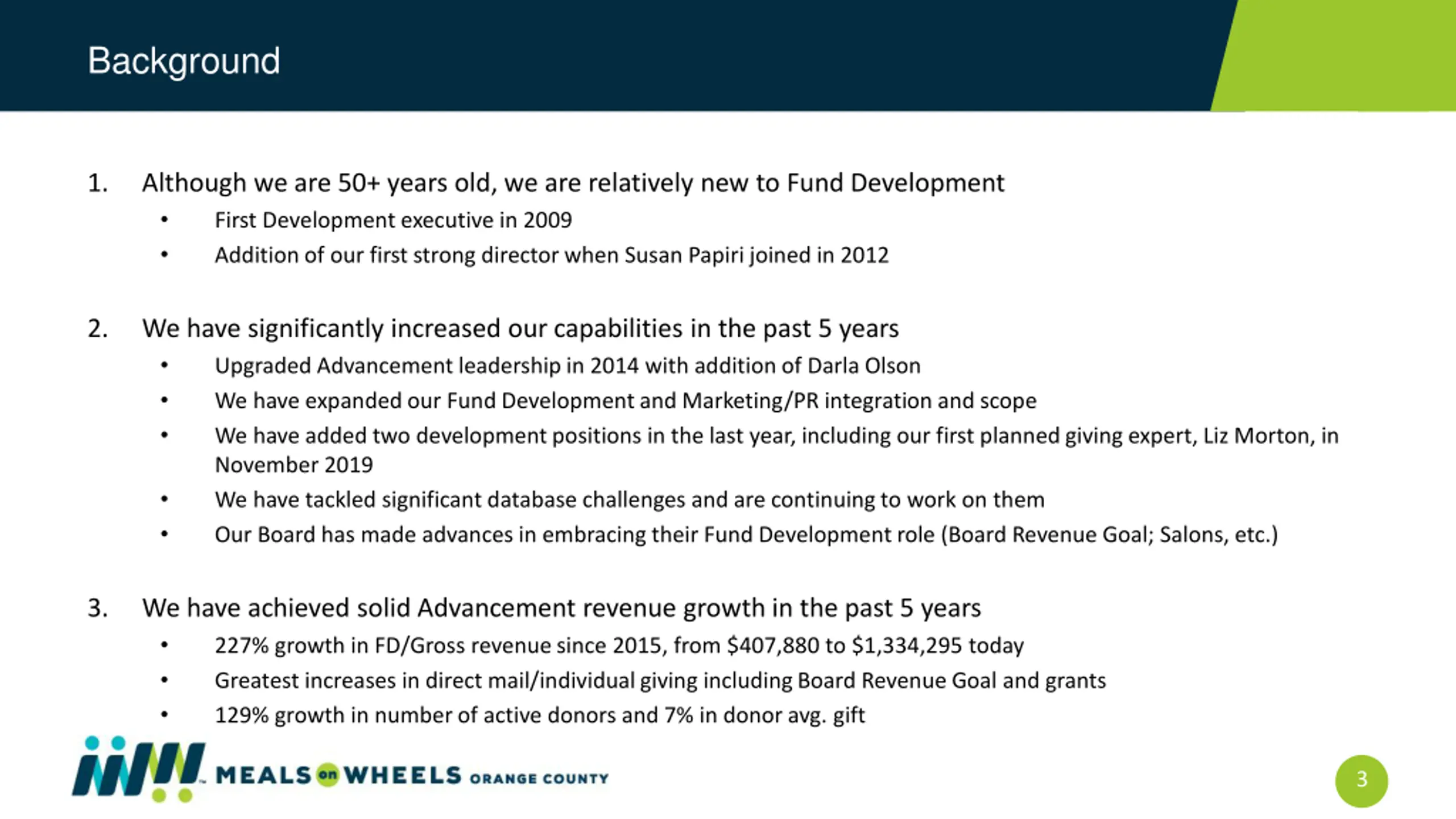 Background 1. Although we are 50+ years old, we are relatively new to Fund Development First Development executive in 2009 Addition of our first strong director when Susan Papiri joined in 2012 2. We have significantly increased our capabilities in the past 5 years Upgraded Advancement leadership in 2014 with addition of Darla Olson We have expanded our Fund Development and Marketing/PR integration and scope We have added two development positions in the last year, including our first planned giving expert, Liz Morton, in November 2019 We have tackled significant database challenges and are continuing to work on them Our Board has made advances in embracing their Fund Development role (Board Revenue Goal; Salons, etc.) 3. We have achieved solid Advancement revenue growth in the past 5 years 227% growth in FD/Gross revenue since 2015, from $407,880 to $1,334,295 today Greatest increases in direct mail/individual giving including Board Revenue Goal and grants 129% growth in number of active donors and 7% in donor avg. gift 3