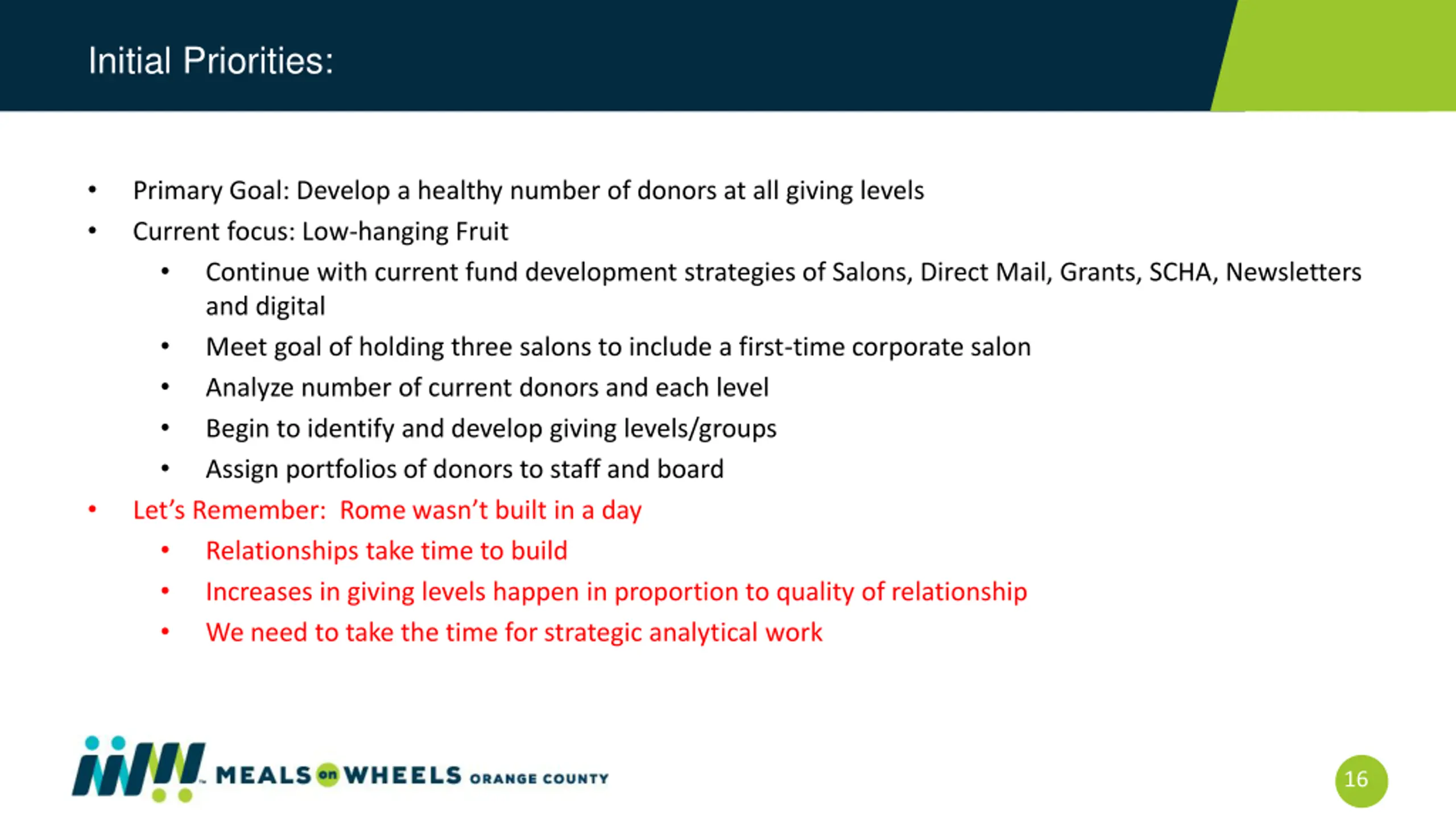 Initial Priorities: Primary Goal: Develop a healthy number of donors at all giving levels Current focus: Low-hanging Fruit Continue with current fund development strategies of Salons, Direct Mail, Grants, SCHA, Newsletters and digital Meet goal of holding three salons to include a first-time corporate salon Analyze number of current donors and each level Begin to identify and develop giving levels/groups Assign portfolios of donors to staff and board Let s Remember: Rome wasn t built in a day Relationships take time to build Increases in giving levels happen in proportion to quality of relationship We need to take the time for strategic analytical work 16