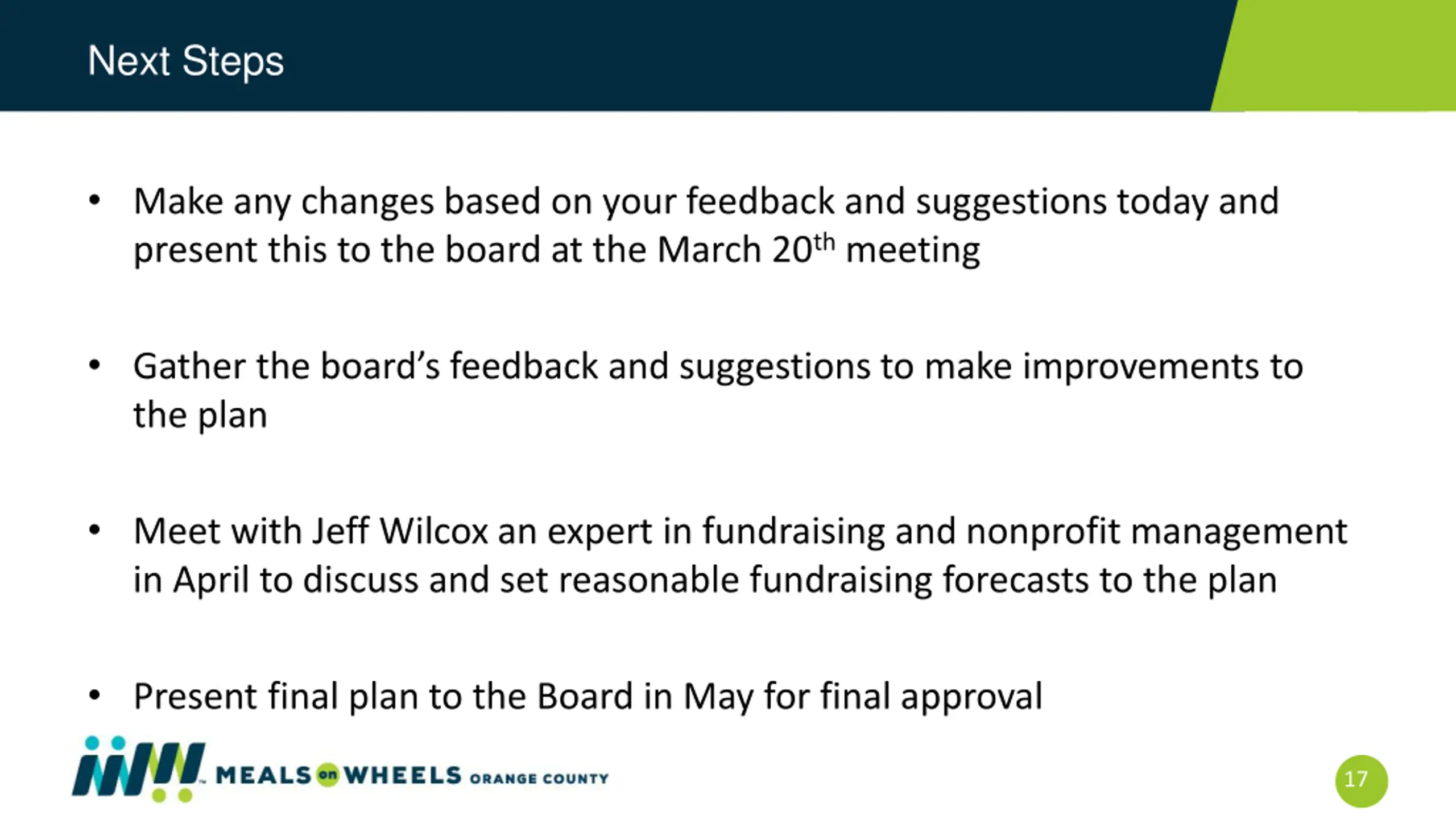 Next Steps Make any changes based on your feedback and suggestions today and present this to the board at the March 20th meeting Gather the board s feedback and suggestions to make improvements to the plan Meet with Jeff Wilcox an expert in fundraising and nonprofit management in April to discuss and set reasonable fundraising forecasts to the plan Present final plan to the Board in May for final approval 17