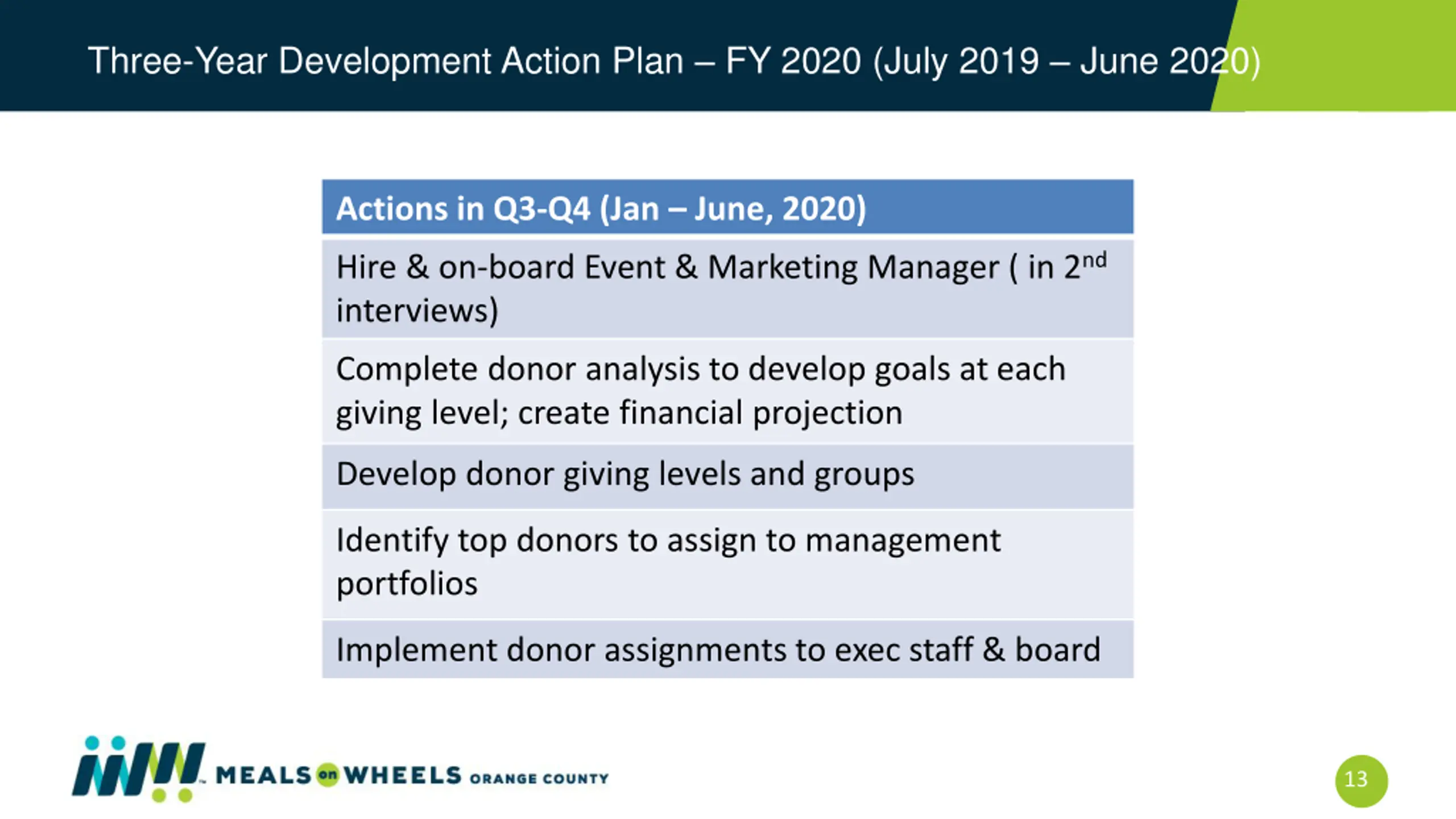 Three-Year Development Action Plan FY 2020 (July 2019 June 2020) Actions in Q3-Q4 (Jan June, 2020) Hire & on-board Event & Marketing Manager ( in 2nd interviews) Complete donor analysis to develop goals at each giving level; create financial projection Develop donor giving levels and groups Identify top donors to assign to management portfolios Implement donor assignments to exec staff & board 13