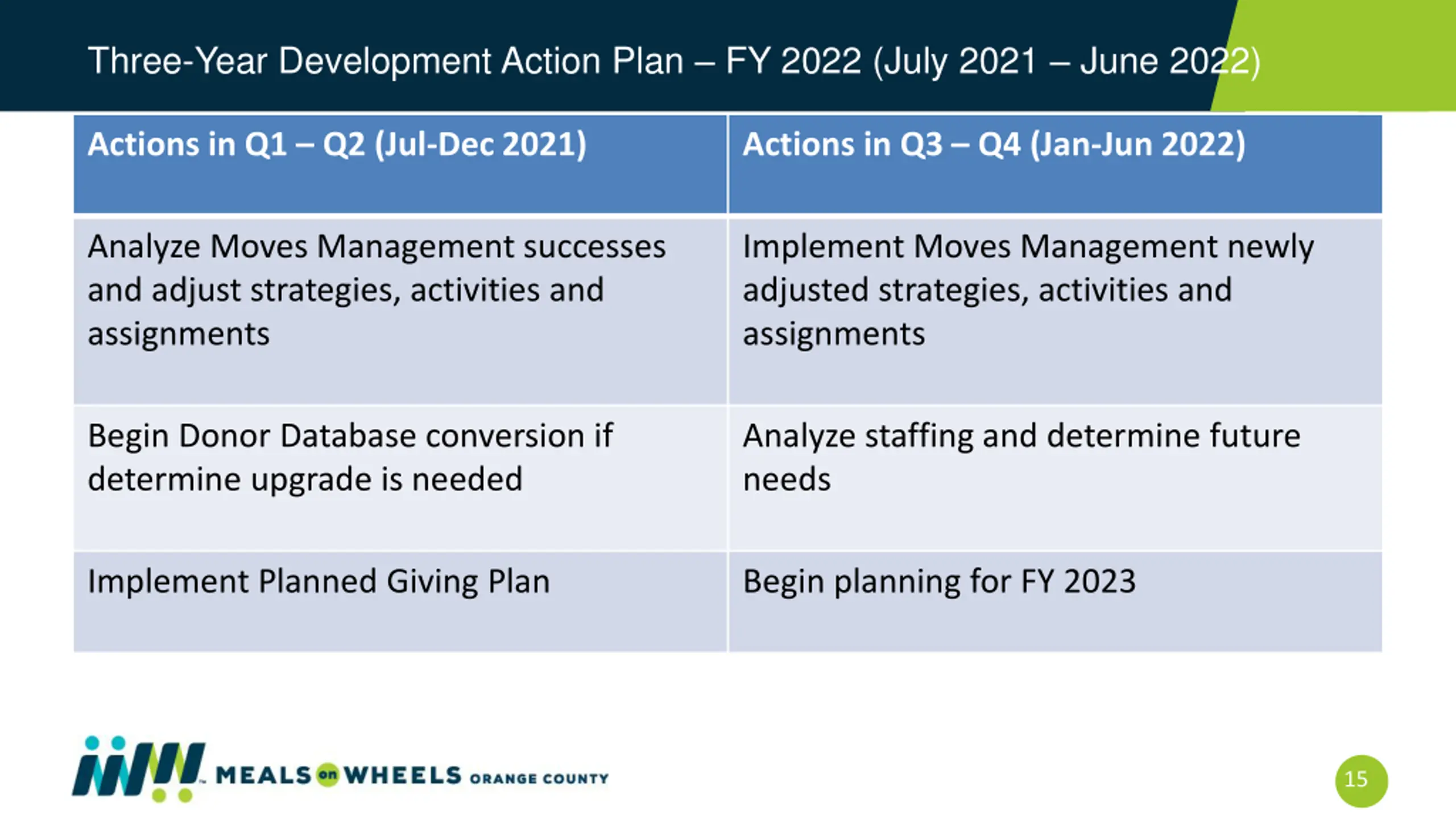 Three-Year Development Action Plan FY 2022 (July 2021 June 2022) Actions in Q1 Q2 (Jul-Dec 2021) Actions in Q3 Q4 (Jan-Jun 2022) Analyze Moves Management successes and adjust strategies, activities and assignments Implement Moves Management newly adjusted strategies, activities and assignments Begin Donor Database conversion if determine upgrade is needed Analyze staffing and determine future needs Implement Planned Giving Plan Begin planning for FY 2023 15