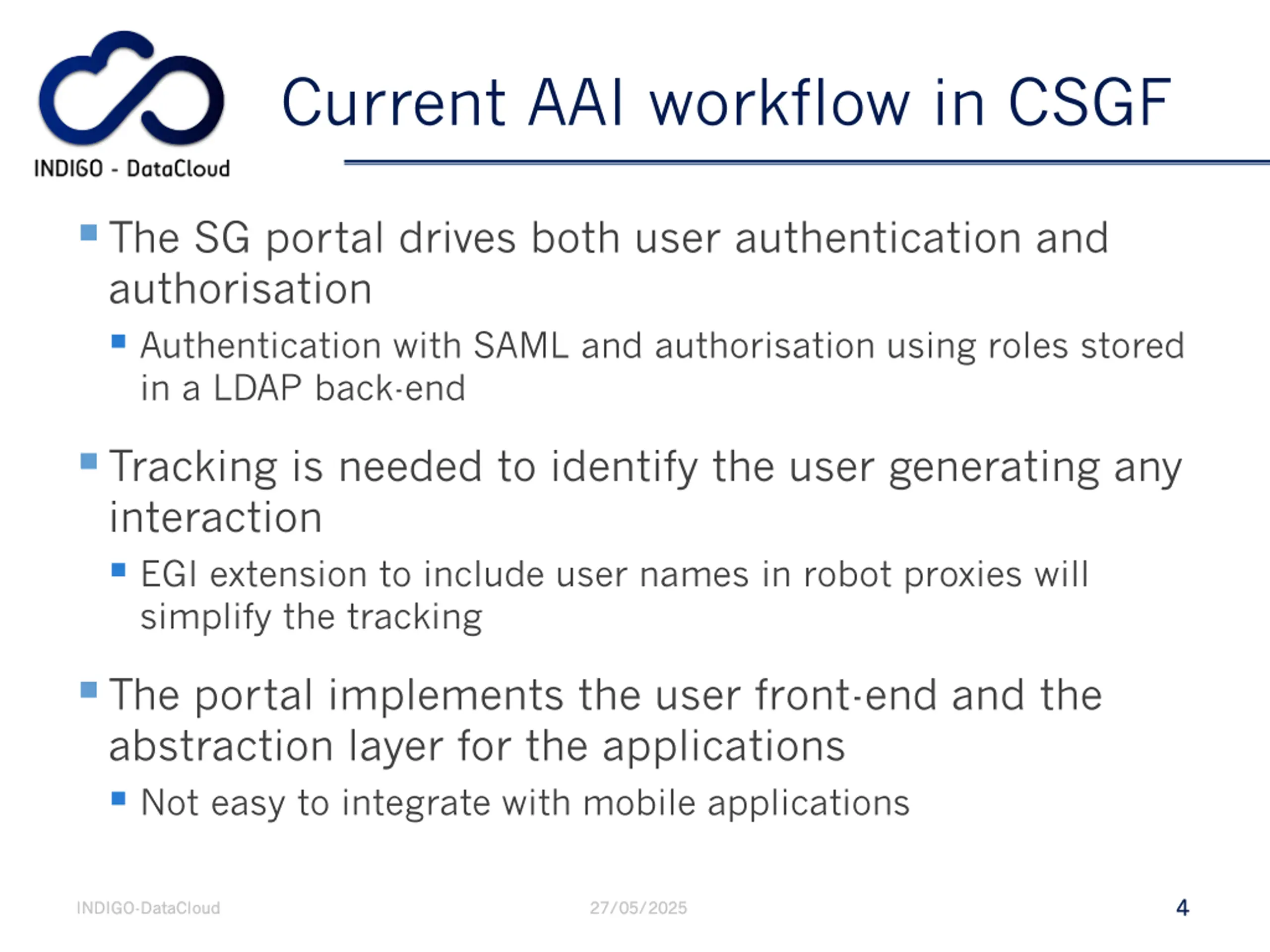 Current AAI workflow in CSGF eTokenServer Identity Provider 1. sign in User6. get the results Local/ Grid/ Cloud SG Admin 3 3 27/05/2025 27/05/2025