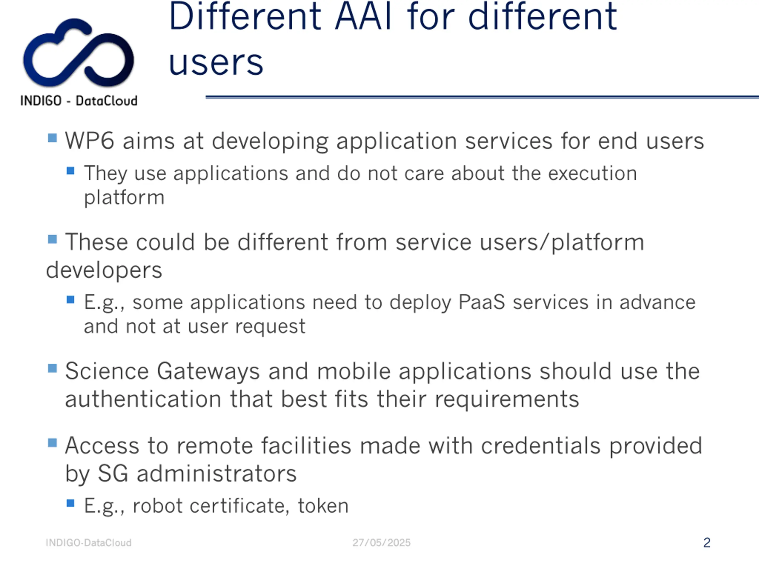 Different AAI for different users WP6 aims at developing application services for end users They use applications and do not care about the execution platform These could be different from service users/platform developers E.g., some applications need to deploy PaaS services in advance and not at user request Science Gateways and mobile applications should use the authentication that best fits their requirements Access to remote facilities made with credentials provided by SG administrators E.g., robot certificate, token 2 INDIGO INDIGO- -DataCloud DataCloud 27/05/2025 27/05/2025