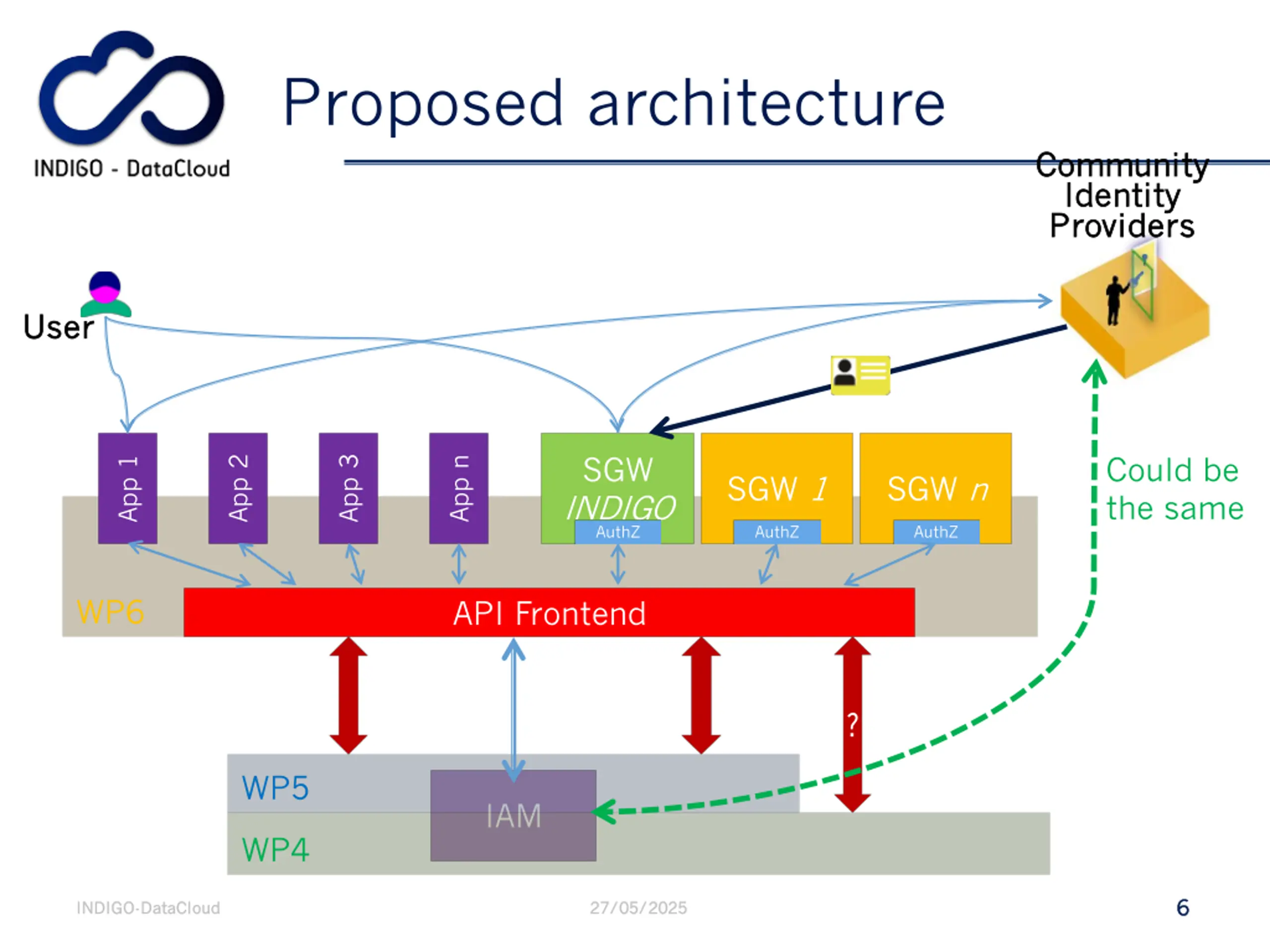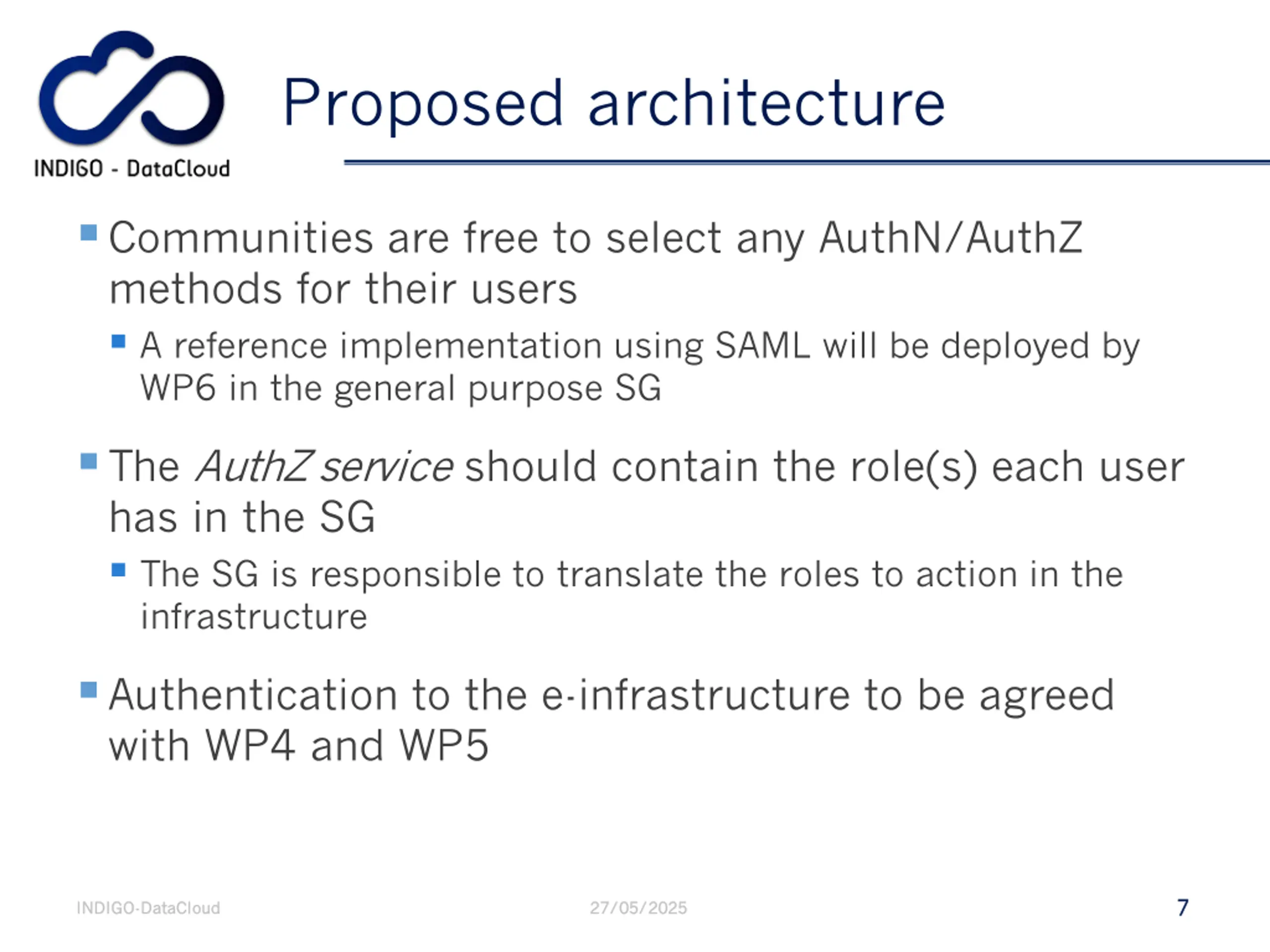Proposed architecture Community Community Identity Identity Providers Providers User User Could be the same SGW INDIGO AuthZ App 1 App 2 App 3 App n SGW 1 SGW n AuthZ AuthZ WP6 API Frontend ? WP5 IAM WP4 6 6 INDIGO INDIGO- -DataCloud DataCloud 27/05/2025 27/05/2025