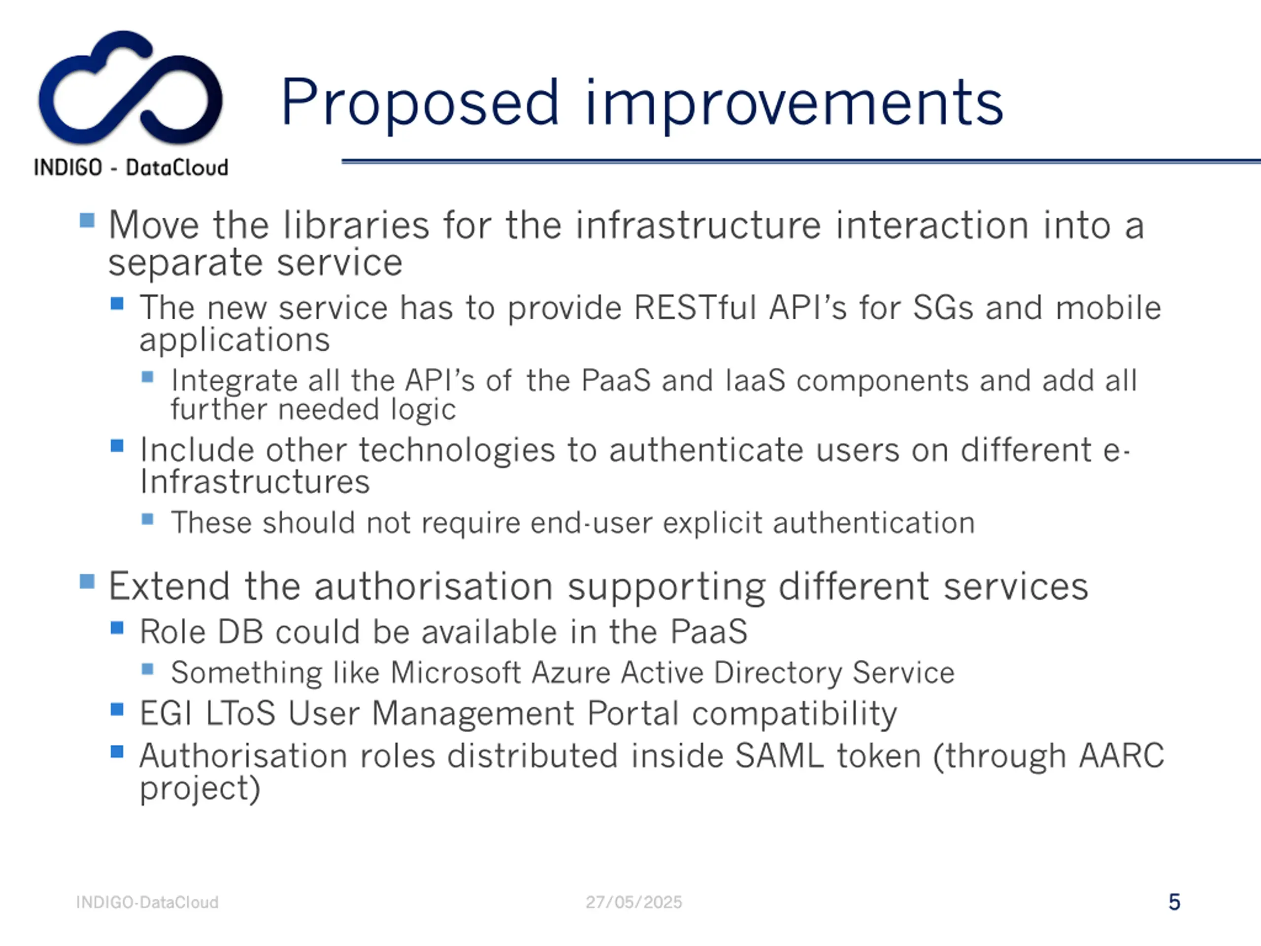 Proposed improvements Move the libraries for the infrastructure interaction into a separate service The new service has to provide RESTful API s for SGs and mobile applications Integrate all the API s of the PaaS and IaaS components and add all further needed logic Include other technologies to authenticate users on different e- Infrastructures These should not require end-user explicit authentication Extend the authorisation supporting different services Role DB could be available in the PaaS Something like Microsoft Azure Active Directory Service EGI LToS User Management Portal compatibility Authorisation roles distributed inside SAML token (through AARC project) 5 5 INDIGO INDIGO- -DataCloud DataCloud 27/05/2025 27/05/2025