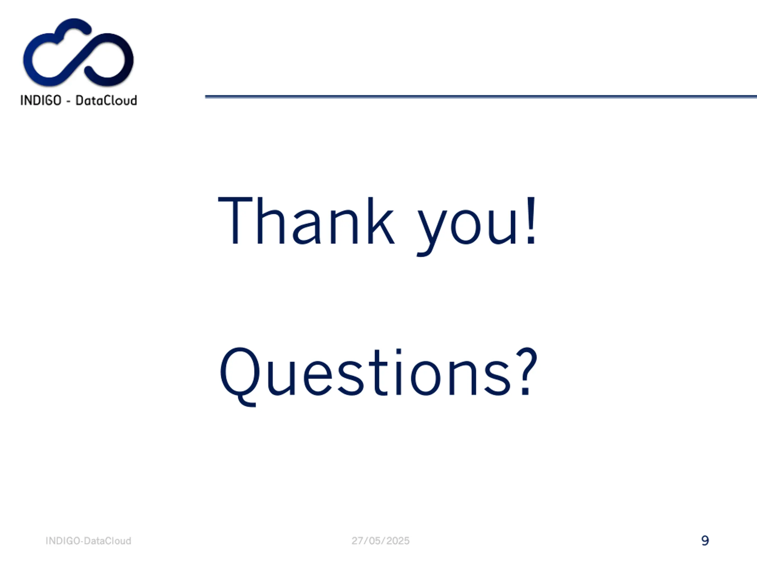 Thank you! Questions? 9 9 INDIGO INDIGO- -DataCloud DataCloud 27/05/2025 27/05/2025