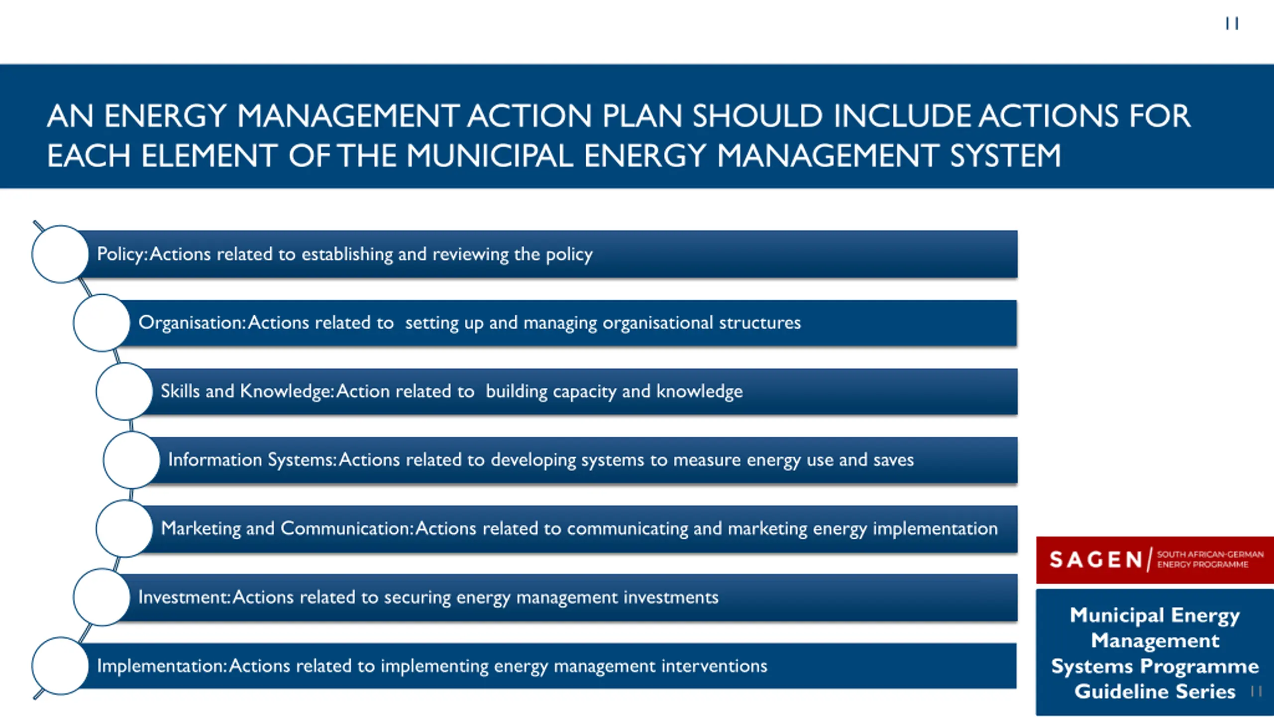 MUNICIPAL ENERGY MANAGEMENT SYSTEMS Policy Investment Organisation Energy Management Systems have many components. For this guideline we will be focussing on the Implementation component Implementation Marketing and Communication Skills and Knowledge Information Systems Municipal Energy Management Systems Programme Guideline Series