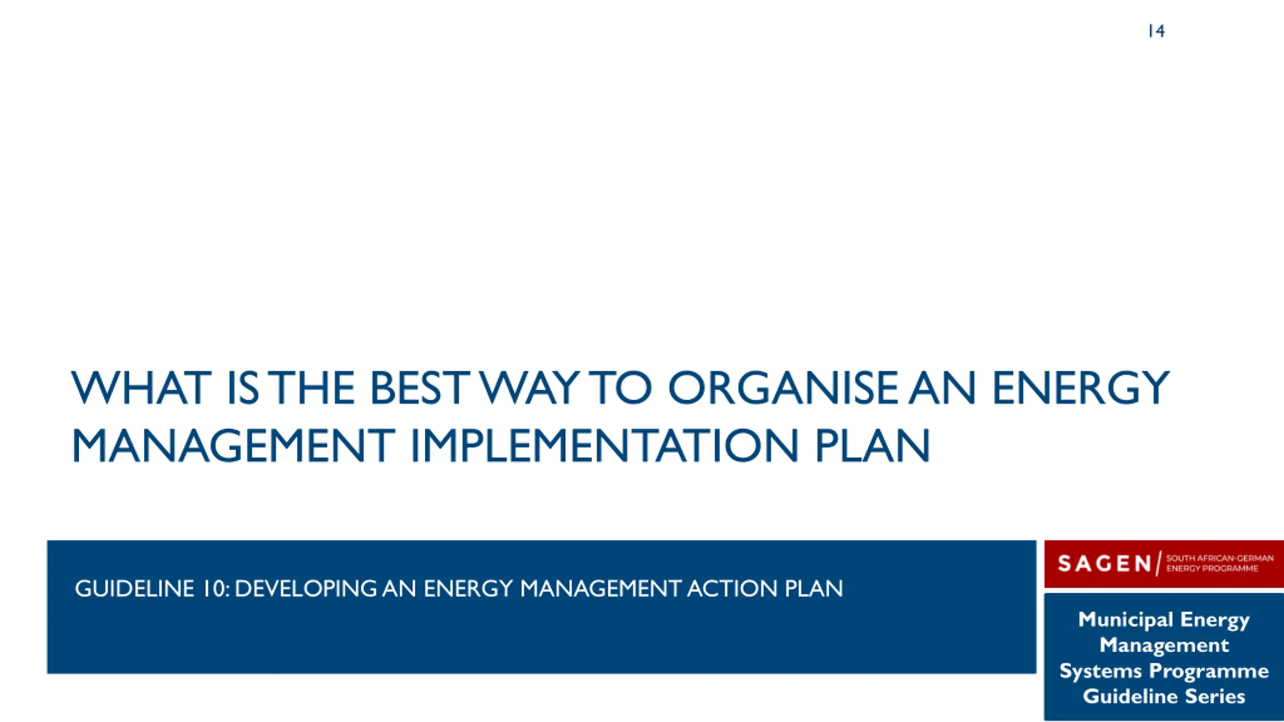 14 WHAT IS THE BEST WAY TO ORGANISE AN ENERGY MANAGEMENT IMPLEMENTATION PLAN GUIDELINE 10: DEVELOPING AN ENERGY MANAGEMENT ACTION PLAN Municipal Energy Management Systems Programme Guideline Series