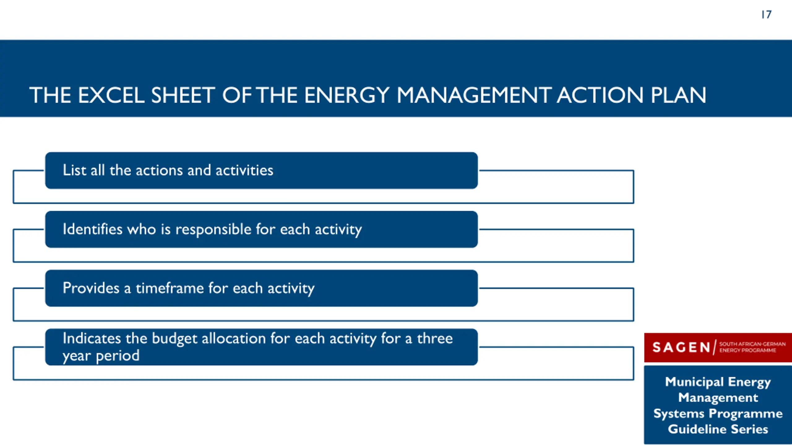 16 THE WORD DOCUMENT FOR THE ENERGY MANAGEMENT ACTION PLAN Provides clear descriptions of each of the actions detailed in the action plan Provides additional details on the actions Provides indicators of success for each of the actions Municipal Energy Management Systems Programme Guideline Series
