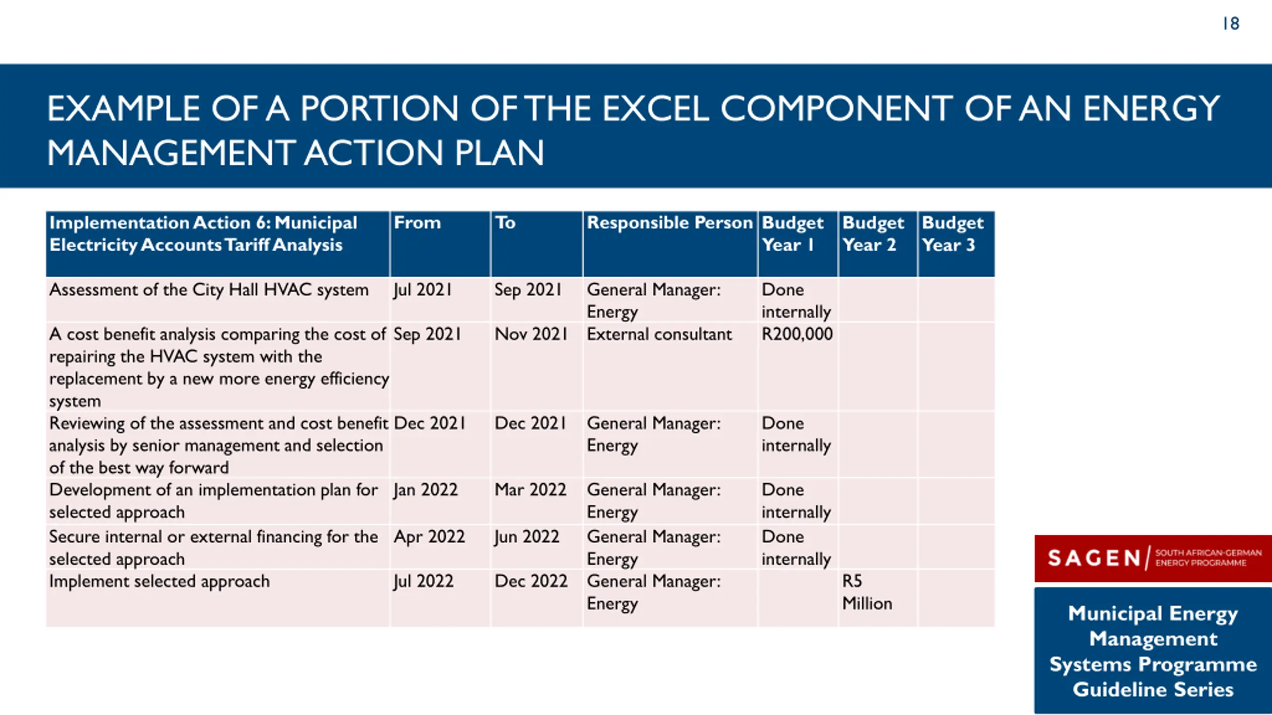 17 THE EXCEL SHEET OF THE ENERGY MANAGEMENT ACTION PLAN List all the actions and activities Identifies who is responsible for each activity Provides a timeframe for each activity Indicates the budget allocation for each activity for a three year period Municipal Energy Management Systems Programme Guideline Series