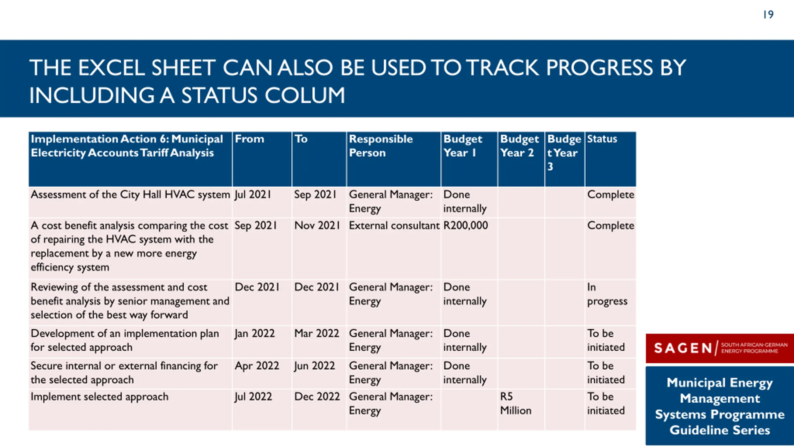 18 EXAMPLE OF A PORTION OF THE EXCEL COMPONENT OF AN ENERGY MANAGEMENT ACTION PLAN From To Responsible Person Budget Implementation Action 6: Municipal Electricity Accounts Tariff Analysis Budget Year 2 Budget Year 3 Year 1 Assessment of the City Hall HVAC system Jul 2021 Sep 2021 General Manager: Energy External consultant Done internally R200,000 A cost benefit analysis comparing the cost of repairing the HVAC system with the replacement by a new more energy efficiency system Reviewing of the assessment and cost benefit analysis by senior management and selection of the best way forward Development of an implementation plan for selected approach Secure internal or external financing for the selected approach Implement selected approach Sep 2021 Nov 2021 Dec 2021 Dec 2021 General Manager: Energy Done internally Jan 2022 Mar 2022 General Manager: Energy General Manager: Energy General Manager: Energy Done internally Done internally Apr 2022 Jun 2022 Jul 2022 Dec 2022 R5 Million Municipal Energy Management Systems Programme Guideline Series