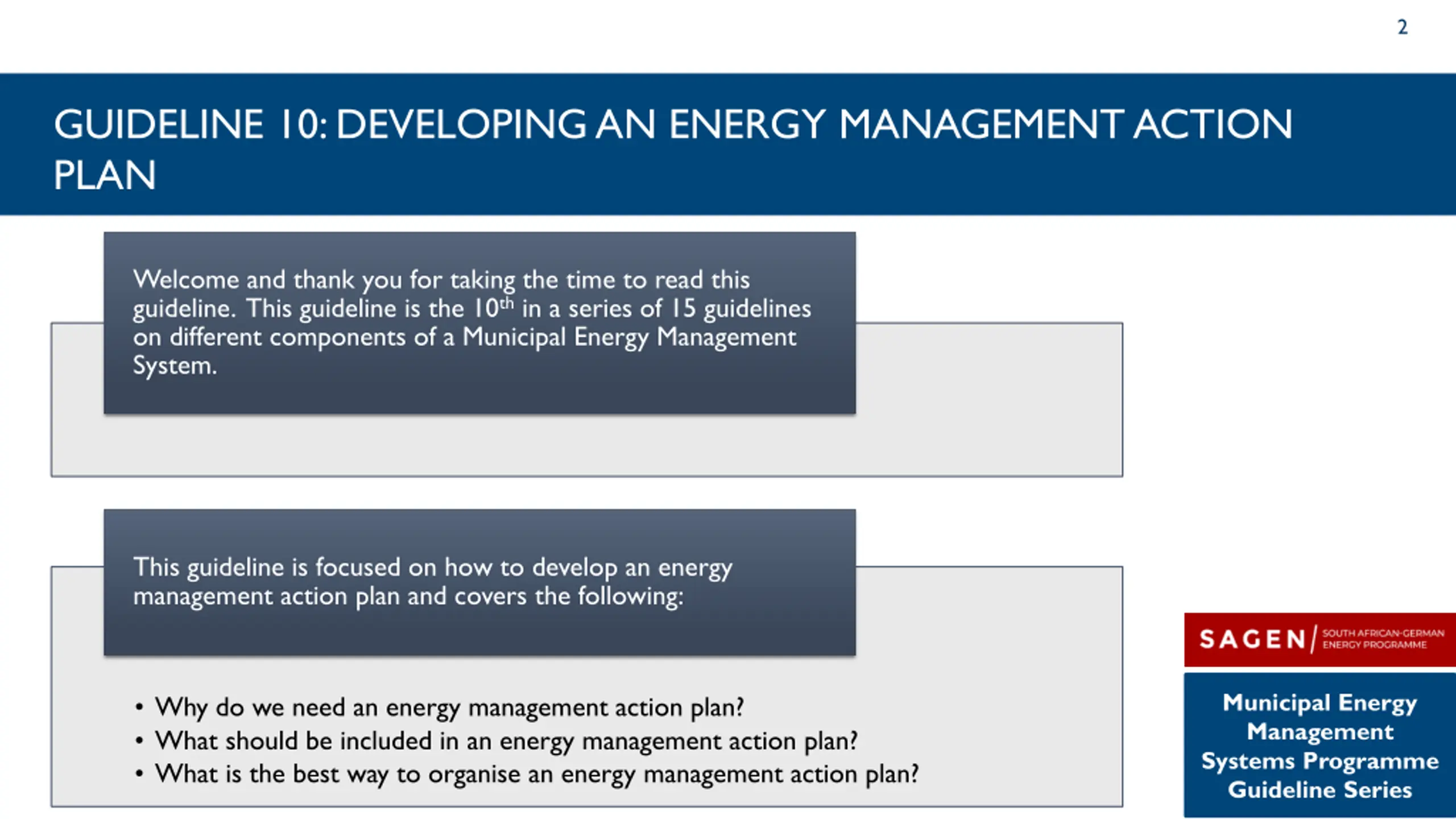 2 GUIDELINE 10: DEVELOPING AN ENERGY MANAGEMENT ACTION PLAN Welcome and thank you for taking the time to read this guideline. This guideline is the 10th in a series of 15 guidelines on different components of a Municipal Energy Management System. This guideline is focused on how to develop an energy management action plan and covers the following: Municipal Energy Management Systems Programme Guideline Series Why do we need an energy management action plan? What should be included in an energy management action plan? What is the best way to organise an energy management action plan?