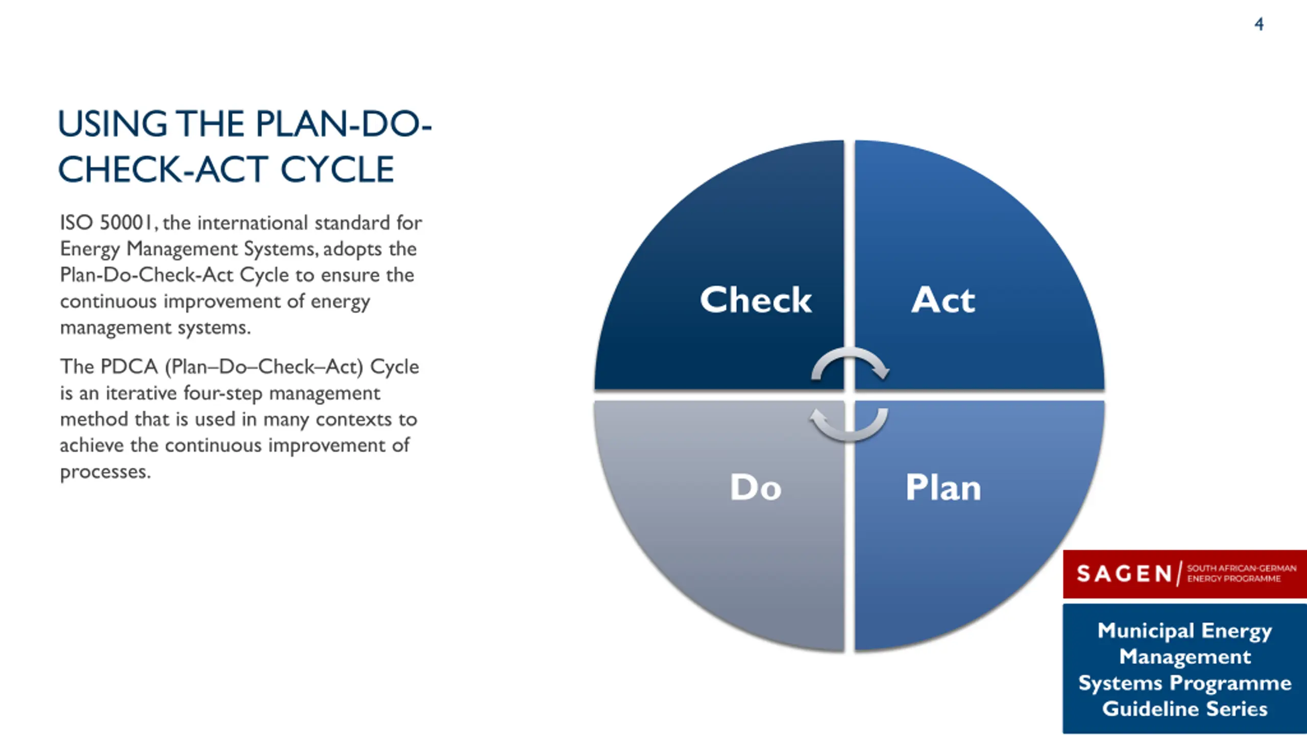 4 USING THE PLAN-DO- CHECK-ACT CYCLE ISO 50001, the international standard for Energy Management Systems, adopts the Plan-Do-Check-Act Cycle to ensure the continuous improvement of energy management systems. Check Act The PDCA (Plan Do Check Act) Cycle is an iterative four-step management method that is used in many contexts to achieve the continuous improvement of processes. Do Plan Municipal Energy Management Systems Programme Guideline Series 4