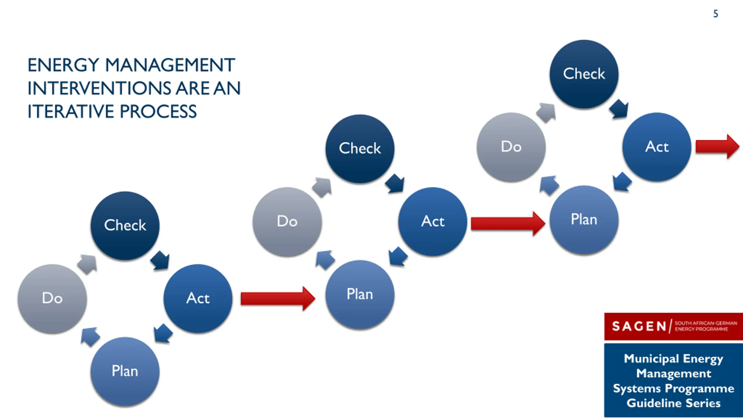 5 IMPLEMENTATION OF ENERGY MANAGEMENT INTERVENTIONS ARE AN ITERATIVE PROCESS Check Do Act Check Plan Do Act Check Plan Do Act Municipal Energy Management Systems Programme Guideline Series Plan 5