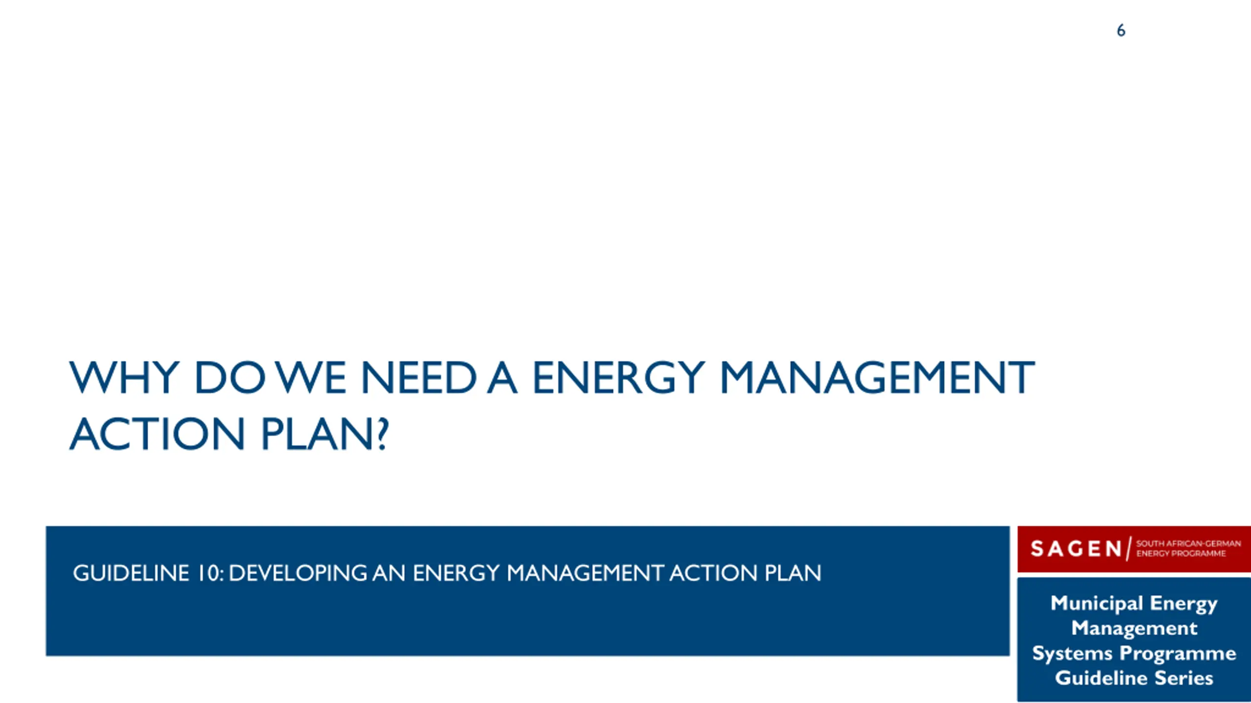6 WHY DO WE NEED A ENERGY MANAGEMENT ACTION PLAN? GUIDELINE 10: DEVELOPING AN ENERGY MANAGEMENT ACTION PLAN Municipal Energy Management Systems Programme Guideline Series