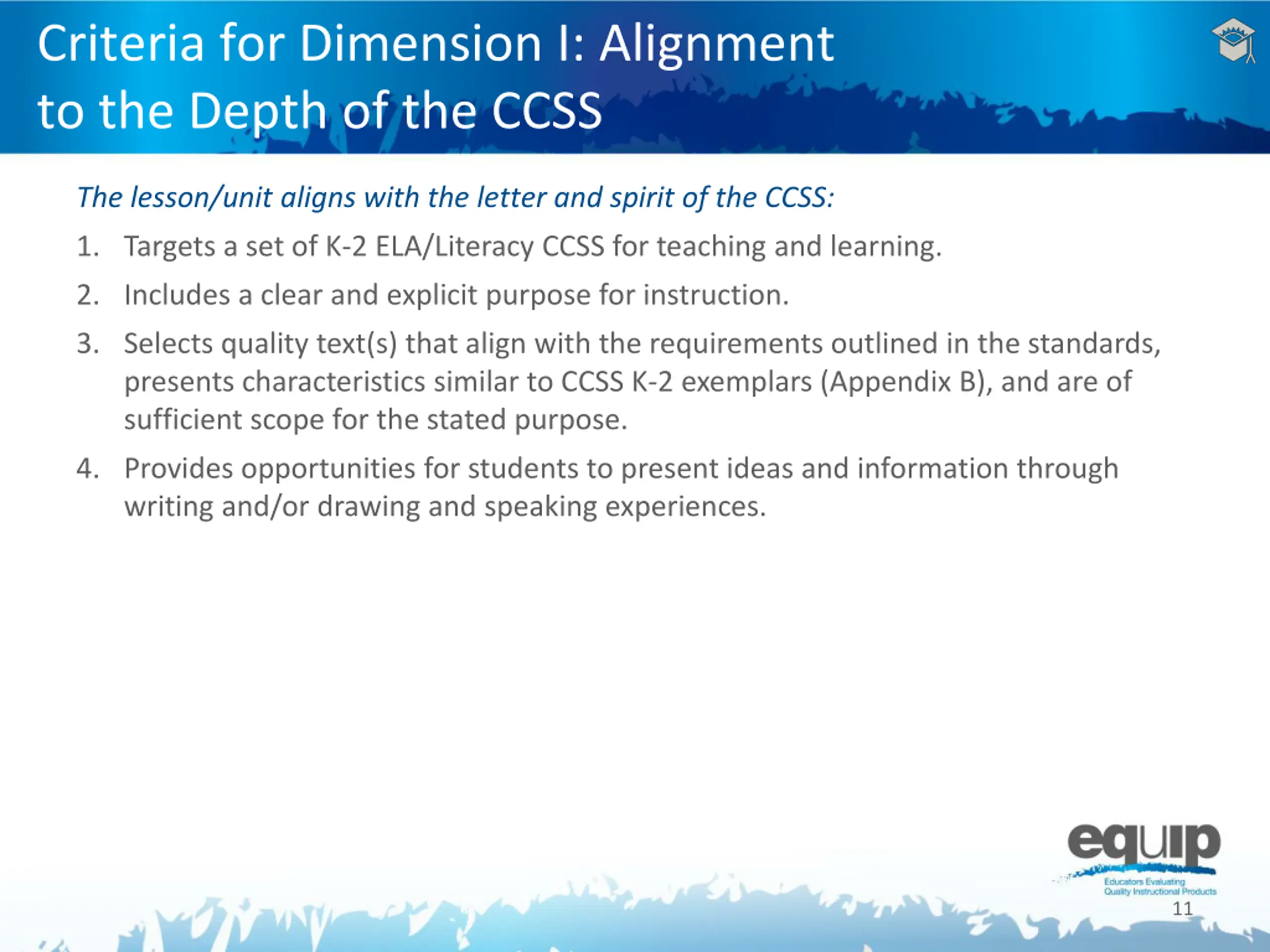 Criteria for Dimension I: Alignment to the Depth of the CCSS The lesson/unit aligns with the letter and spirit of the CCSS: 1. Targets a set of K-2 ELA/Literacy CCSS for teaching and learning. 2. Includes a clear and explicit purpose for instruction. 3. Selects quality text(s) that align with the requirements outlined in the standards, presents characteristics similar to CCSS K-2 exemplars (Appendix B), and are of sufficient scope for the stated purpose. 4. Provides opportunities for students to present ideas and information through writing and/or drawing and speaking experiences. 11