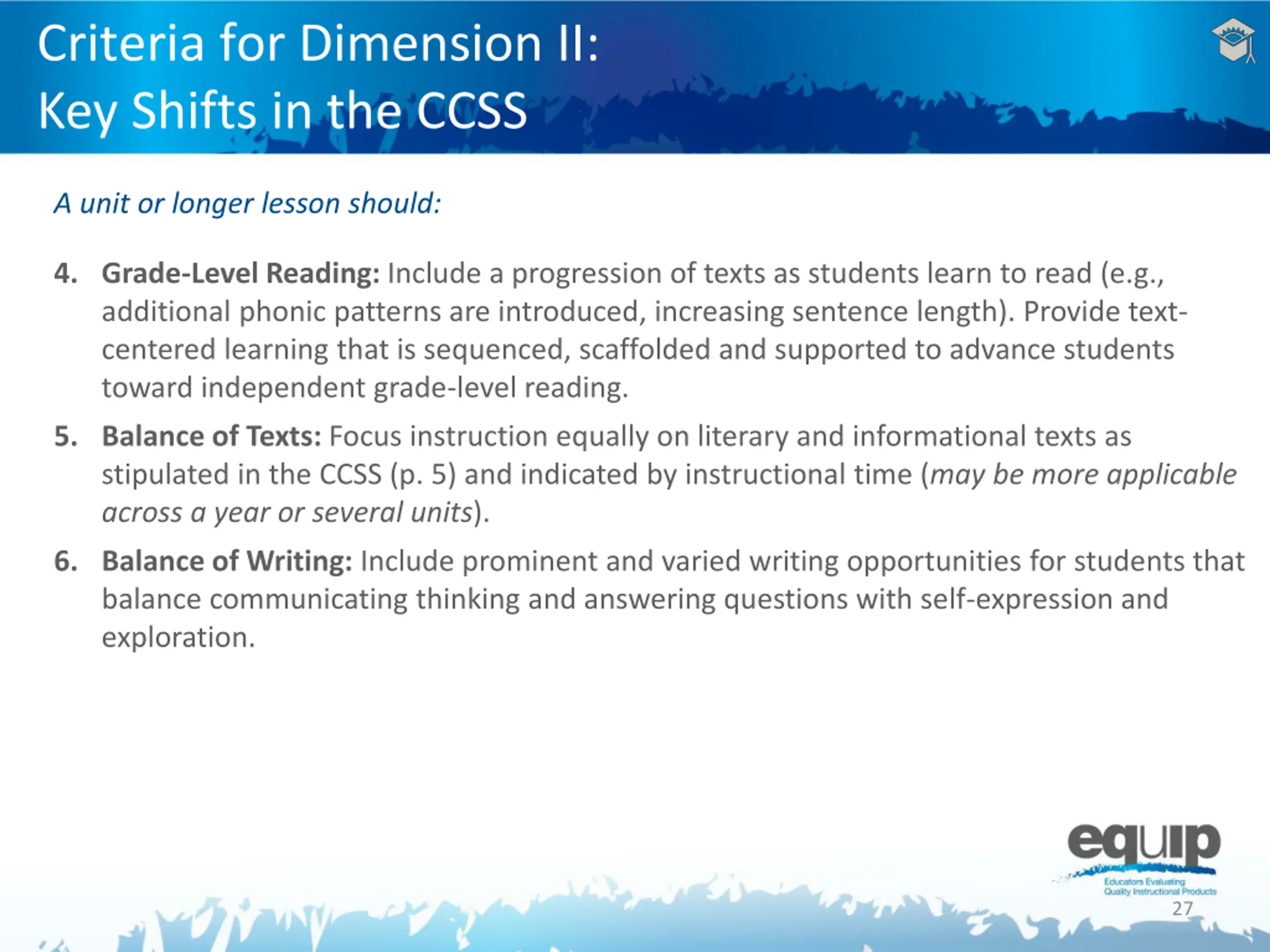 Criteria for Dimension II: Key Shifts in the CCSS A unit or longer lesson should: 4. Grade-Level Reading: Include a progression of texts as students learn to read (e.g., additional phonic patterns are introduced, increasing sentence length). Provide text- centered learning that is sequenced, scaffolded and supported to advance students toward independent grade-level reading. 5. Balance of Texts: Focus instruction equally on literary and informational texts as stipulated in the CCSS (p. 5) and indicated by instructional time (may be more applicable across a year or several units). 6. Balance of Writing: Include prominent and varied writing opportunities for students that balance communicating thinking and answering questions with self-expression and exploration. 27