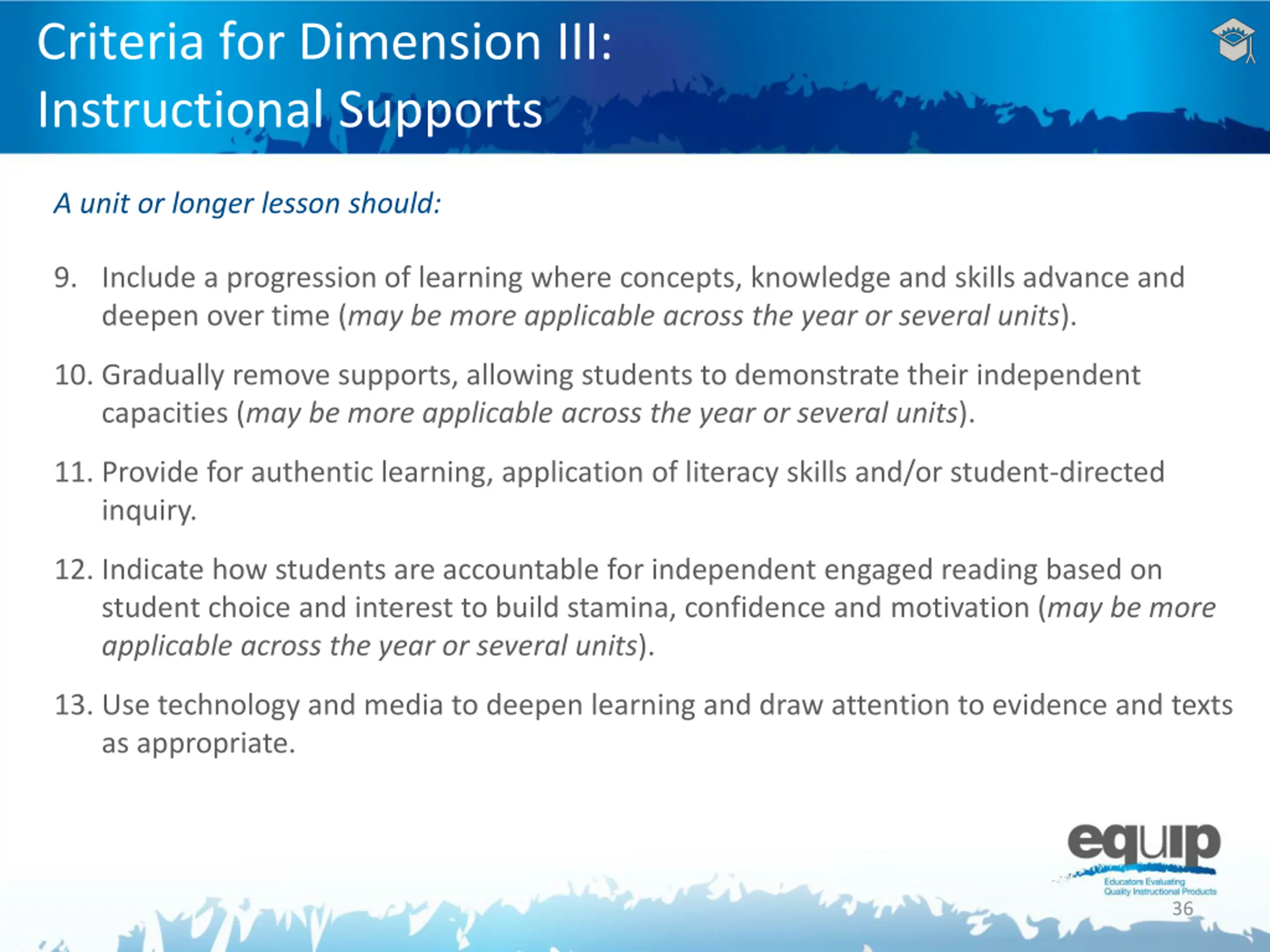 Criteria for Dimension III: Instructional Supports A unit or longer lesson should: 9. Include a progression of learning where concepts, knowledge and skills advance and deepen over time (may be more applicable across the year or several units). 10. Gradually remove supports, allowing students to demonstrate their independent capacities (may be more applicable across the year or several units). 11. Provide for authentic learning, application of literacy skills and/or student-directed inquiry. 12. Indicate how students are accountable for independent engaged reading based on student choice and interest to build stamina, confidence and motivation (may be more applicable across the year or several units). 13. Use technology and media to deepen learning and draw attention to evidence and texts as appropriate. 36