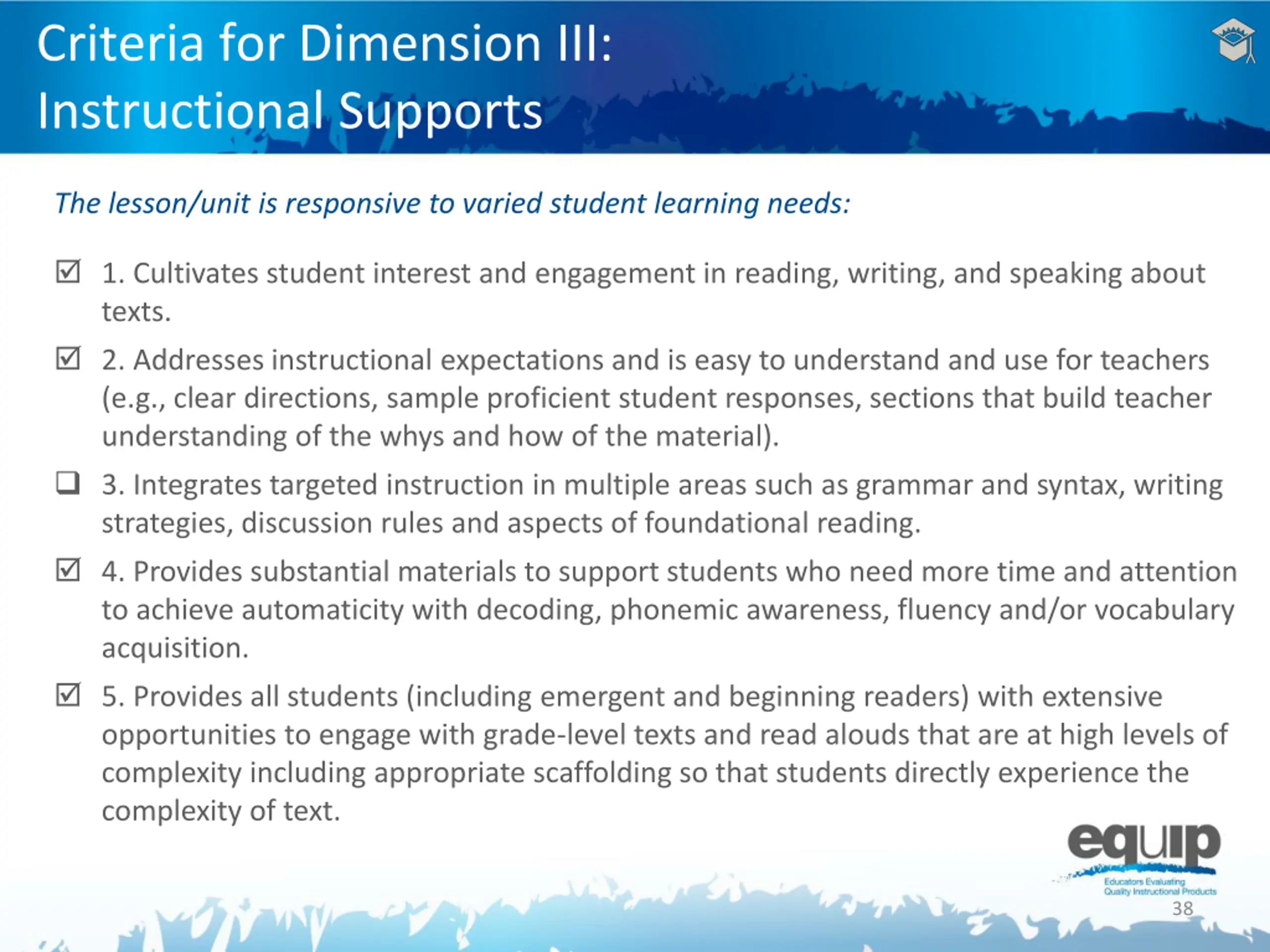 Criteria for Dimension III: Instructional Supports The lesson/unit is responsive to varied student learning needs: 1. Cultivates student interest and engagement in reading, writing, and speaking about texts. 2. Addresses instructional expectations and is easy to understand and use for teachers (e.g., clear directions, sample proficient student responses, sections that build teacher understanding of the whys and how of the material). 3. Integrates targeted instruction in multiple areas such as grammar and syntax, writing strategies, discussion rules and aspects of foundational reading. 4. Provides substantial materials to support students who need more time and attention to achieve automaticity with decoding, phonemic awareness, fluency and/or vocabulary acquisition. 5. Provides all students (including emergent and beginning readers) with extensive opportunities to engage with grade-level texts and read alouds that are at high levels of complexity including appropriate scaffolding so that students directly experience the complexity of text. 38