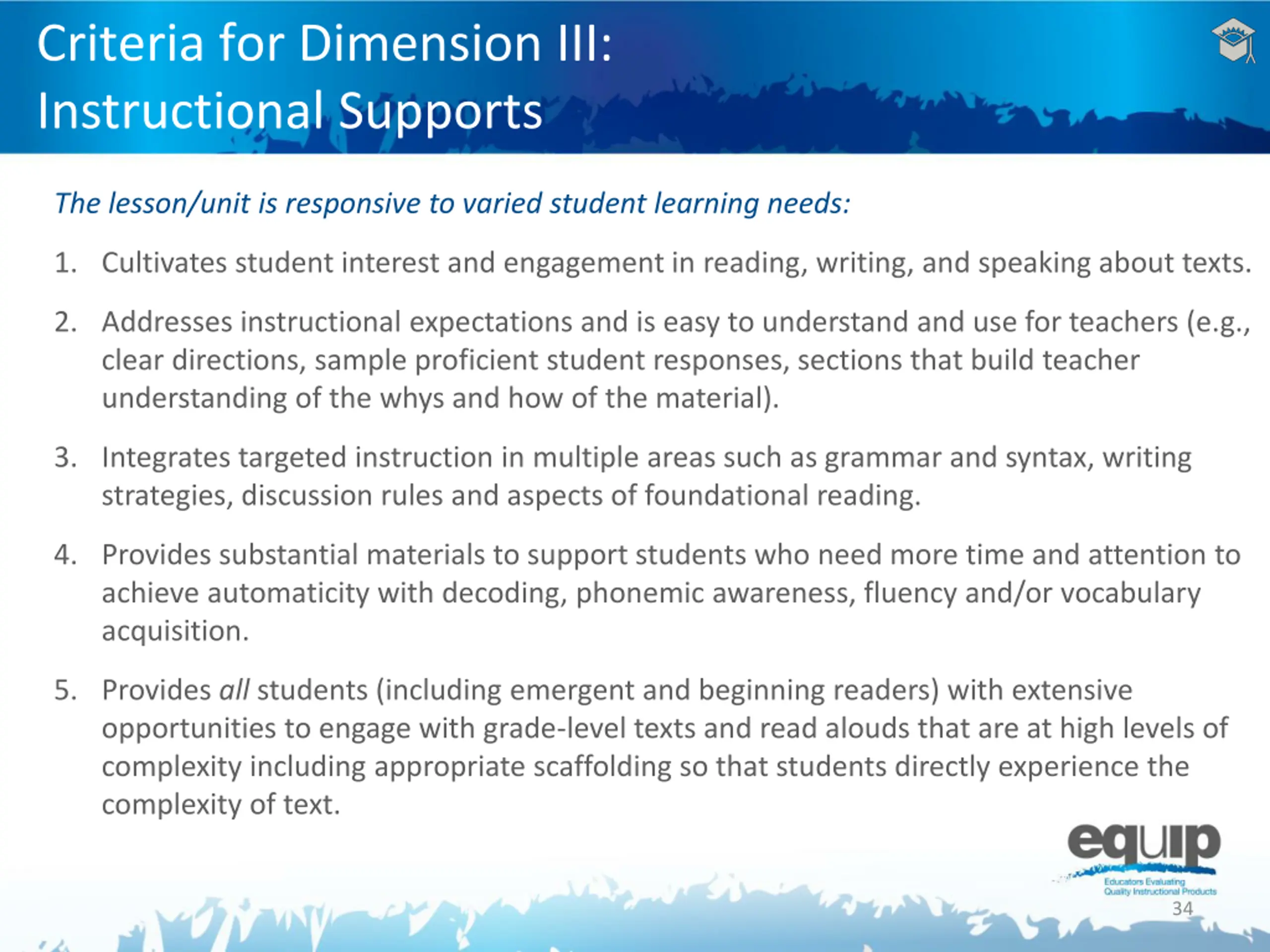 Criteria for Dimension III: Instructional Supports The lesson/unit is responsive to varied student learning needs: 1. Cultivates student interest and engagement in reading, writing, and speaking about texts. 2. Addresses instructional expectations and is easy to understand and use for teachers (e.g., clear directions, sample proficient student responses, sections that build teacher understanding of the whys and how of the material). 3. Integrates targeted instruction in multiple areas such as grammar and syntax, writing strategies, discussion rules and aspects of foundational reading. 4. Provides substantial materials to support students who need more time and attention to achieve automaticity with decoding, phonemic awareness, fluency and/or vocabulary acquisition. 5. Provides all students (including emergent and beginning readers) with extensive opportunities to engage with grade-level texts and read alouds that are at high levels of complexity including appropriate scaffolding so that students directly experience the complexity of text. 34