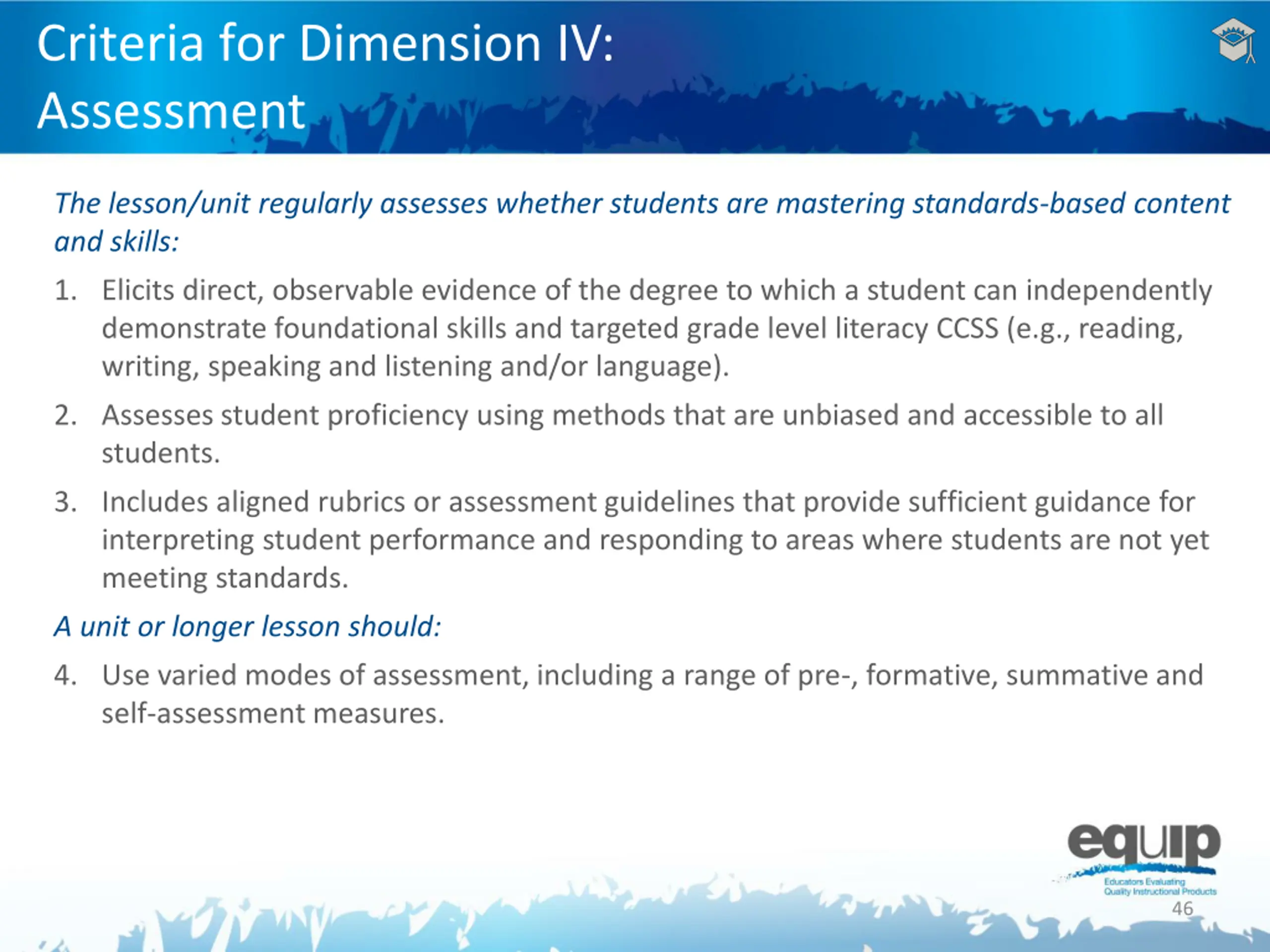 EXAMPLE: Step 3. Apply Criteria in Dimension IV: Assessment The lesson/unit regularly assesses whether students are mastering standards-based content and skills: 1. Elicits direct, observable evidence of the degree to which a student can independently demonstrate foundational skills and targeted grade level literacy CCSS (e.g., reading, writing, speaking and listening and/or language). 2. Assesses student proficiency using methods that are unbiased and accessible to all students. 3. Includes aligned rubrics or assessment guidelines that provide sufficient guidance for interpreting student performance and responding to areas where students are not yet meeting standards. A unit or longer lesson should: 4. Use varied modes of assessment, including a range of pre-, formative, summative and self-assessment measures. 48