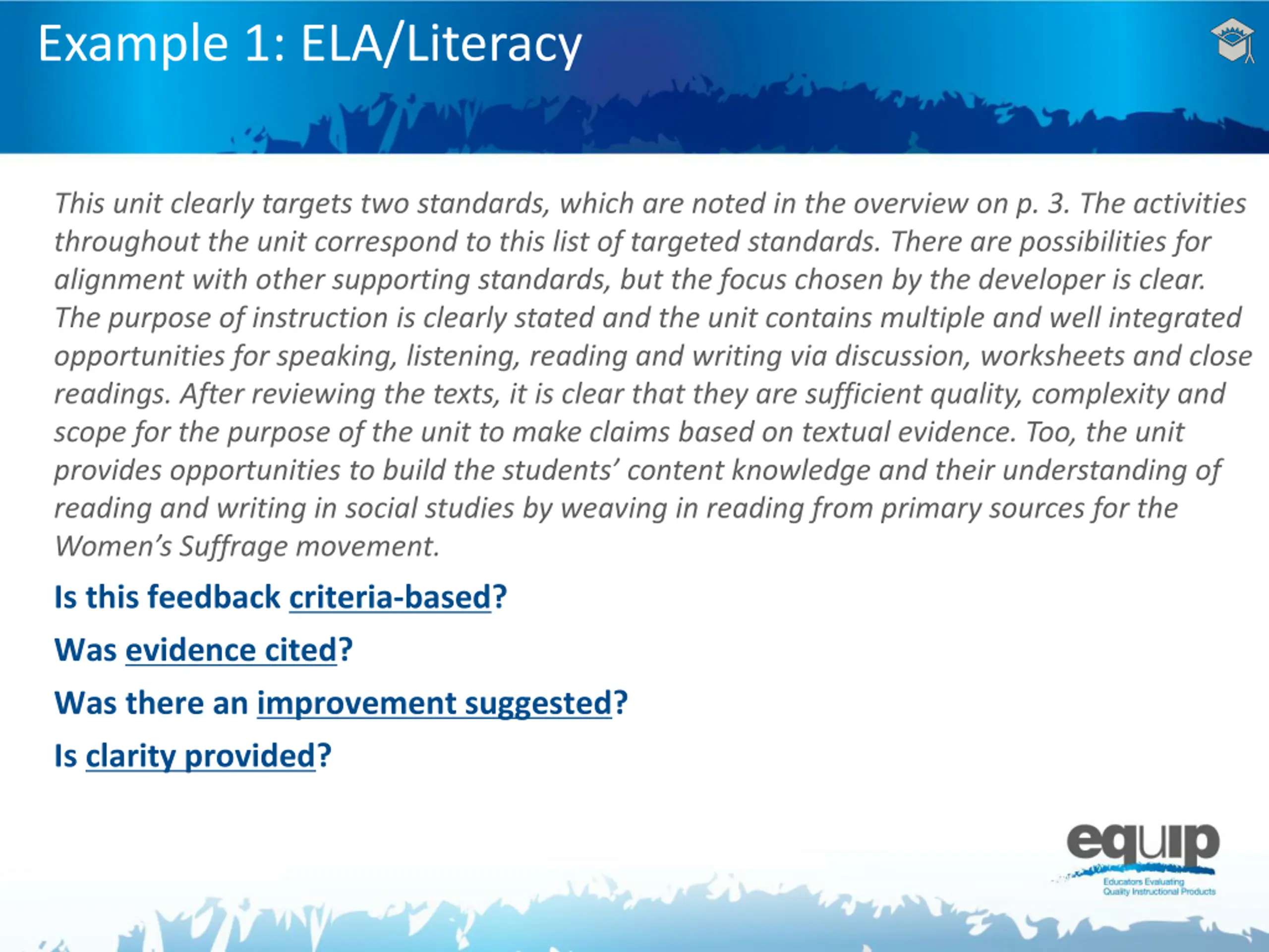 Example 1: ELA/Literacy This unit clearly targets two standards, which are noted in the overview on p. 3. The activities throughout the unit correspond to this list of targeted standards. There are possibilities for alignment with other supporting standards, but the focus chosen by the developer is clear. The purpose of instruction is clearly stated and the unit contains multiple and well integrated opportunities for speaking, listening, reading and writing via discussion, worksheets and close readings. After reviewing the texts, it is clear that they are sufficient quality, complexity and scope for the purpose of the unit to make claims based on textual evidence. Too, the unit provides opportunities to build the students content knowledge and their understanding of reading and writing in social studies by weaving in reading from primary sources for the Women s Suffrage movement. Is this feedback criteria-based? Was evidence cited? Was there an improvement suggested? Is clarity provided?