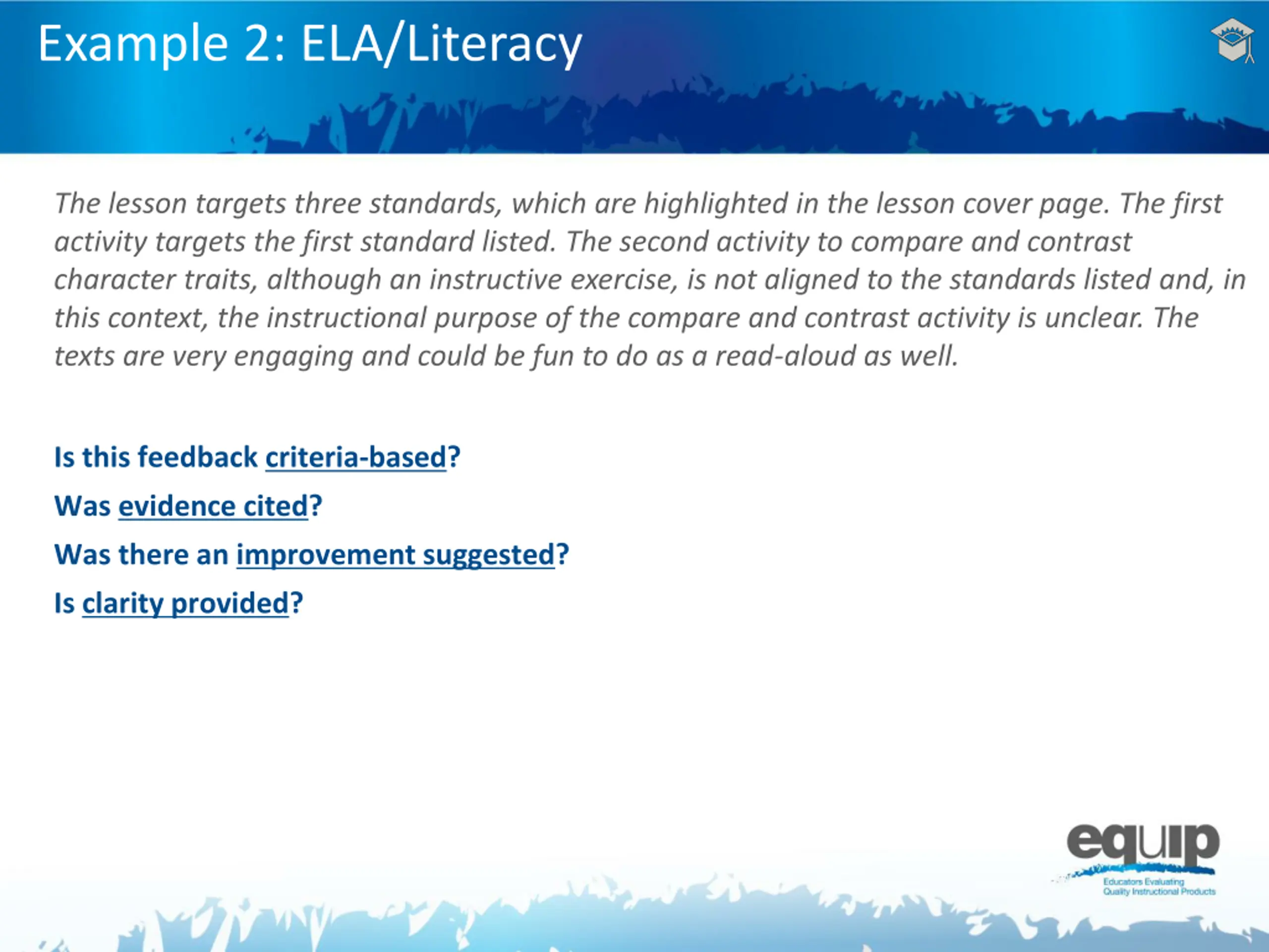 Example 2: ELA/Literacy The lesson targets three standards, which are highlighted in the lesson cover page. The first activity targets the first standard listed. The second activity to compare and contrast character traits, although an instructive exercise, is not aligned to the standards listed and, in this context, the instructional purpose of the compare and contrast activity is unclear. The texts are very engaging and could be fun to do as a read-aloud as well. Is this feedback criteria-based? Was evidence cited? Was there an improvement suggested? Is clarity provided?