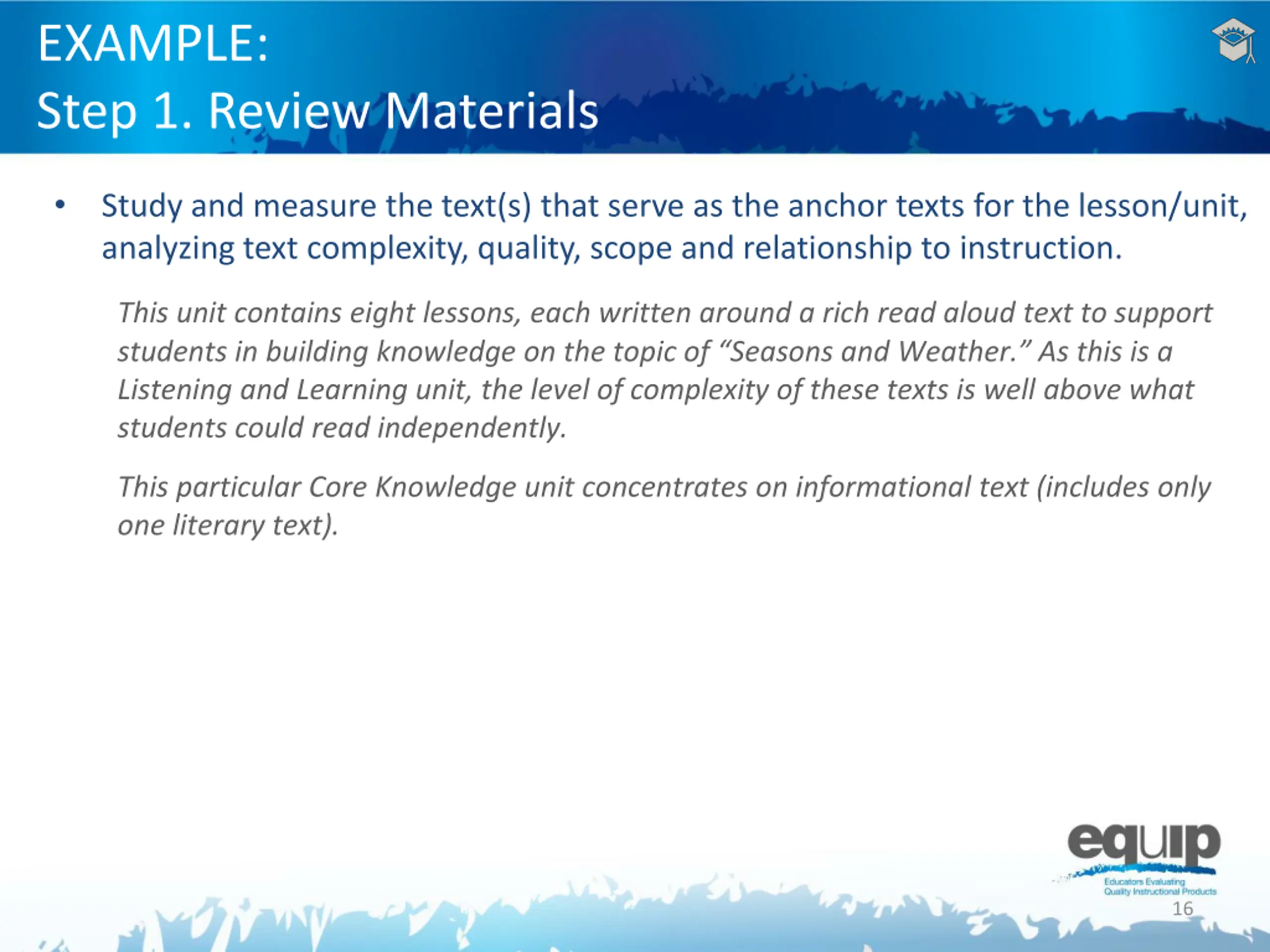 EXAMPLE: Step 1. Review Materials Study and measure the text(s) that serve as the anchor texts for the lesson/unit, analyzing text complexity, quality, scope and relationship to instruction. This unit contains eight lessons, each written around a rich read aloud text to support students in building knowledge on the topic of Seasons and Weather. As this is a Listening and Learning unit, the level of complexity of these texts is well above what students could read independently. This particular Core Knowledge unit concentrates on informational text (includes only one literary text). 16