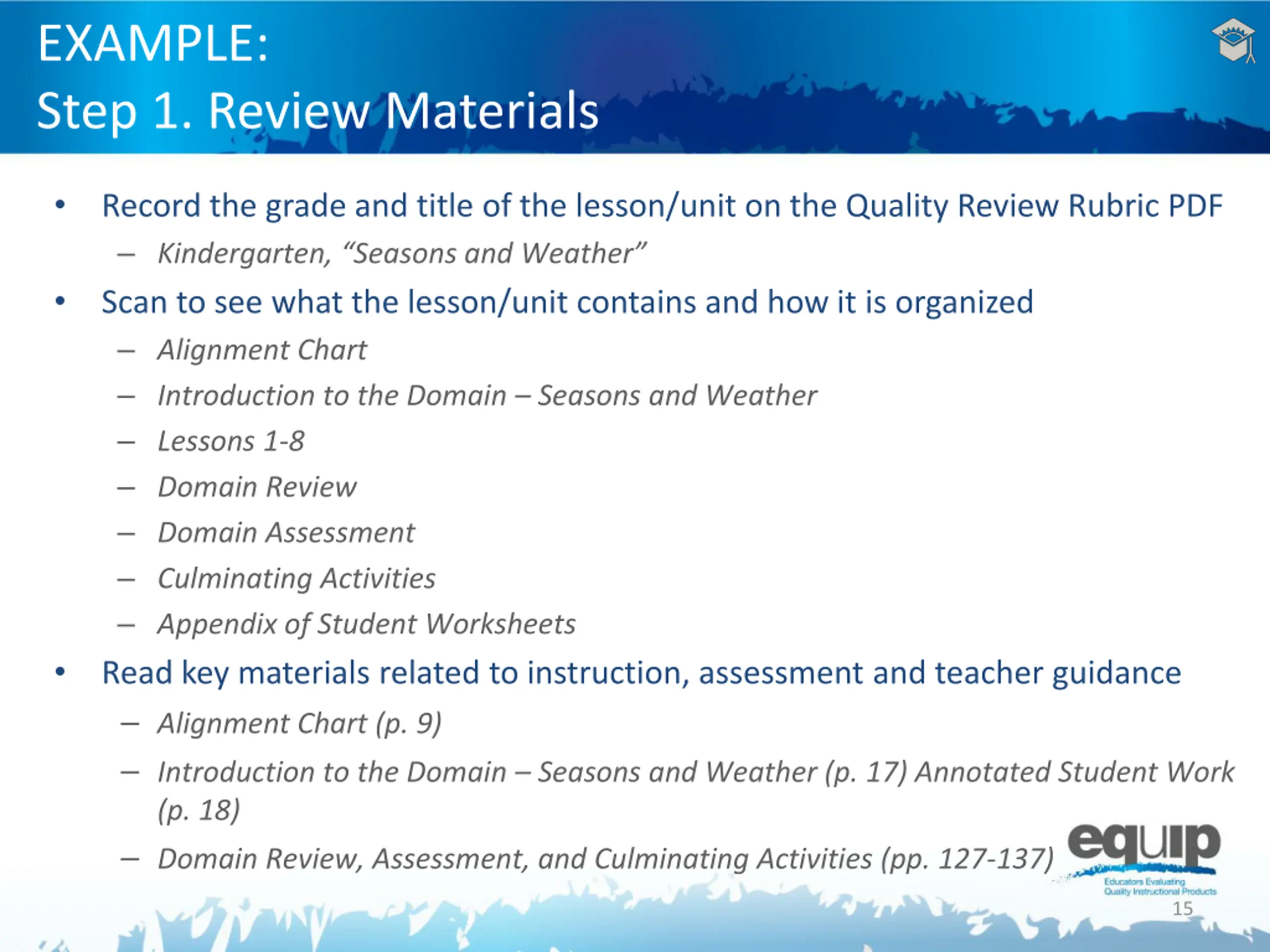 EXAMPLE: Step 1. Review Materials Record the grade and title of the lesson/unit on the Quality Review Rubric PDF Kindergarten, Seasons and Weather Scan to see what the lesson/unit contains and how it is organized Alignment Chart Introduction to the Domain Seasons and Weather Lessons 1-8 Domain Review Domain Assessment Culminating Activities Appendix of Student Worksheets Read key materials related to instruction, assessment and teacher guidance Alignment Chart (p. 9) Introduction to the Domain Seasons and Weather (p. 17) Annotated Student Work (p. 18) Domain Review, Assessment, and Culminating Activities (pp. 127-137) 15