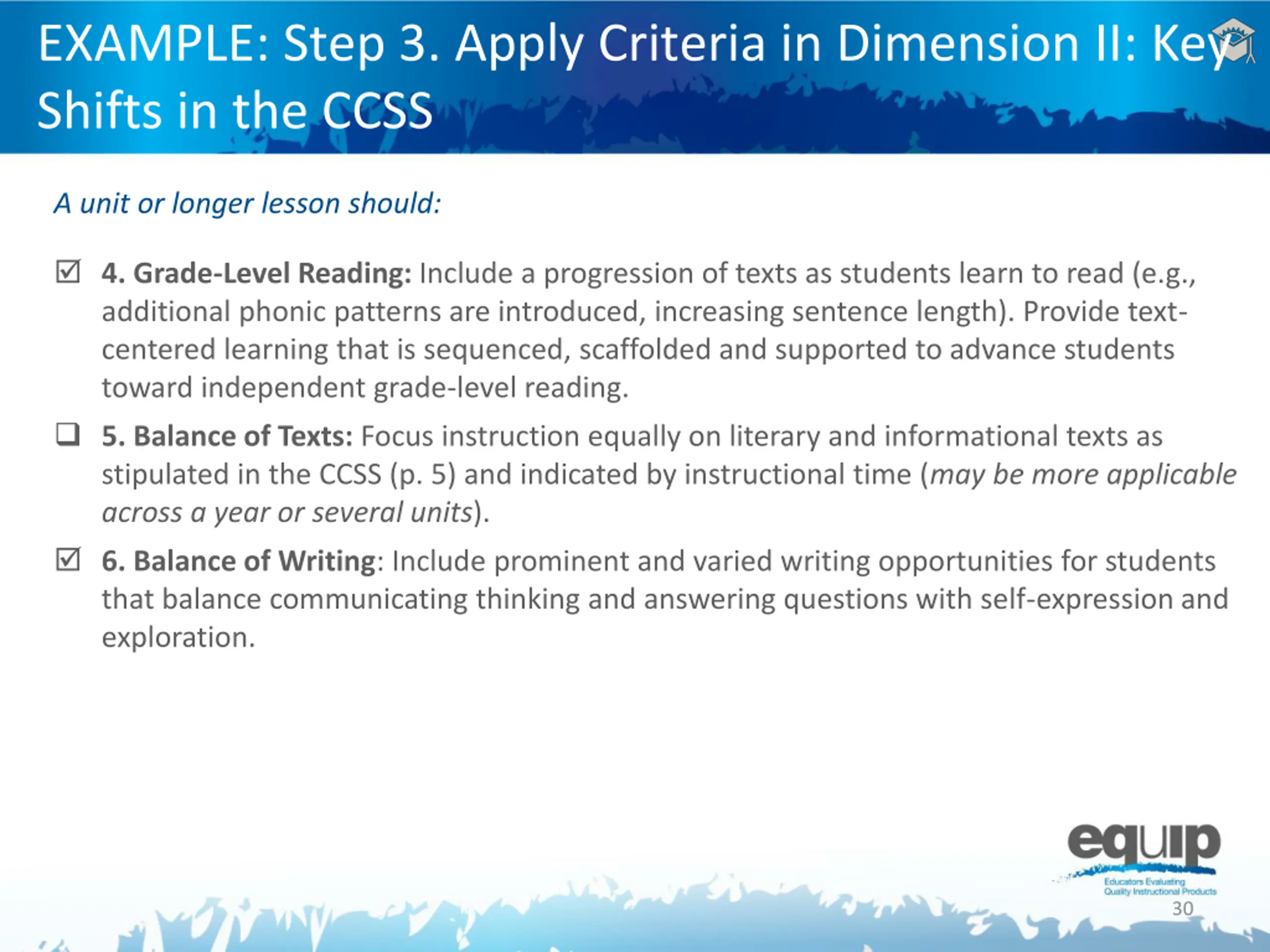 EXAMPLE: Step 3. Apply Criteria in Dimension II: Key Shifts in the CCSS A unit or longer lesson should: 4. Grade-Level Reading: Include a progression of texts as students learn to read (e.g., additional phonic patterns are introduced, increasing sentence length). Provide text- centered learning that is sequenced, scaffolded and supported to advance students toward independent grade-level reading. 5. Balance of Texts: Focus instruction equally on literary and informational texts as stipulated in the CCSS (p. 5) and indicated by instructional time (may be more applicable across a year or several units). 6. Balance of Writing: Include prominent and varied writing opportunities for students that balance communicating thinking and answering questions with self-expression and exploration. 30