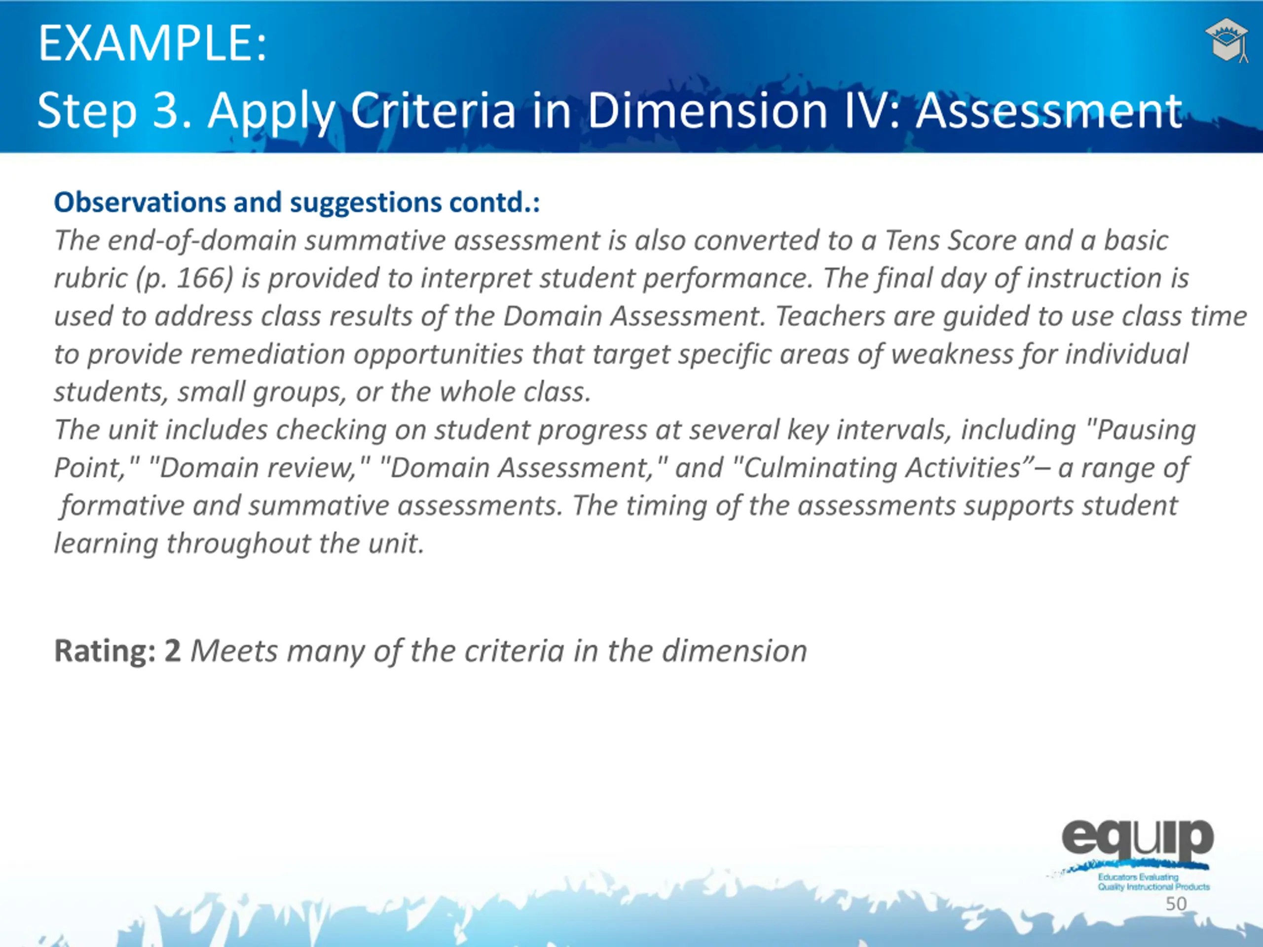EXAMPLE: Step 3. Apply Criteria in Dimension IV: Assessment Observations and suggestions contd.: The end-of-domain summative assessment is also converted to a Tens Score and a basic rubric (p. 166) is provided to interpret student performance. The final day of instruction is used to address class results of the Domain Assessment. Teachers are guided to use class time to provide remediation opportunities that target specific areas of weakness for individual students, small groups, or the whole class. The unit includes checking on student progress at several key intervals, including "Pausing Point," "Domain review," "Domain Assessment," and "Culminating Activities a range of formative and summative assessments. The timing of the assessments supports student learning throughout the unit. Rating: 2 Meets many of the criteria in the dimension 50