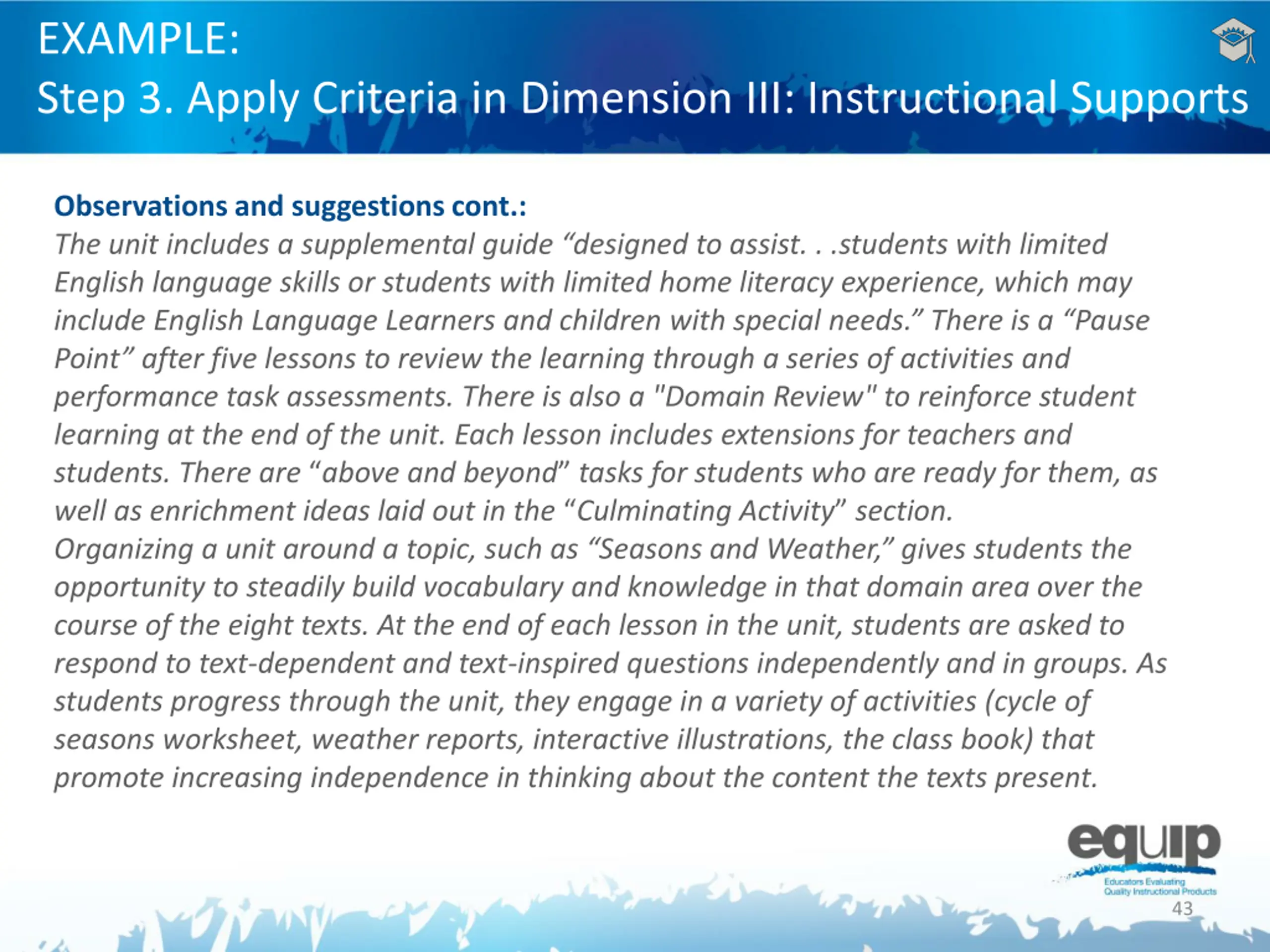 EXAMPLE: Step 3. Apply Criteria in Dimension III: Instructional Supports Observations and suggestions cont.: The unit includes a supplemental guide designed to assist. . .students with limited English language skills or students with limited home literacy experience, which may include English Language Learners and children with special needs. There is a Pause Point after five lessons to review the learning through a series of activities and performance task assessments. There is also a "Domain Review" to reinforce student learning at the end of the unit. Each lesson includes extensions for teachers and students. There are above and beyond tasks for students who are ready for them, as well as enrichment ideas laid out in the Culminating Activity section. Organizing a unit around a topic, such as Seasons and Weather, gives students the opportunity to steadily build vocabulary and knowledge in that domain area over the course of the eight texts. At the end of each lesson in the unit, students are asked to respond to text-dependent and text-inspired questions independently and in groups. As students progress through the unit, they engage in a variety of activities (cycle of seasons worksheet, weather reports, interactive illustrations, the class book) that promote increasing independence in thinking about the content the texts present. 43