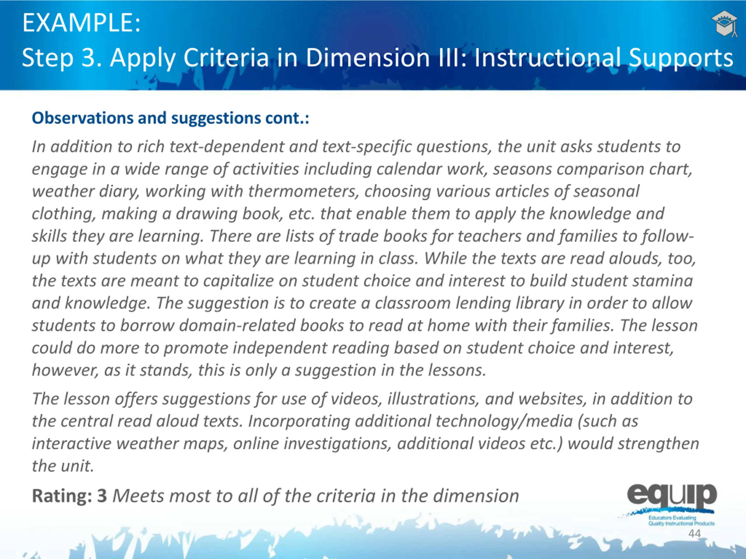 EXAMPLE: Step 3. Apply Criteria in Dimension III: Instructional Supports Observations and suggestions cont.: In addition to rich text-dependent and text-specific questions, the unit asks students to engage in a wide range of activities including calendar work, seasons comparison chart, weather diary, working with thermometers, choosing various articles of seasonal clothing, making a drawing book, etc. that enable them to apply the knowledge and skills they are learning. There are lists of trade books for teachers and families to follow- up with students on what they are learning in class. While the texts are read alouds, too, the texts are meant to capitalize on student choice and interest to build student stamina and knowledge. The suggestion is to create a classroom lending library in order to allow students to borrow domain-related books to read at home with their families. The lesson could do more to promote independent reading based on student choice and interest, however, as it stands, this is only a suggestion in the lessons. The lesson offers suggestions for use of videos, illustrations, and websites, in addition to the central read aloud texts. Incorporating additional technology/media (such as interactive weather maps, online investigations, additional videos etc.) would strengthen the unit. Rating: 3 Meets most to all of the criteria in the dimension 44