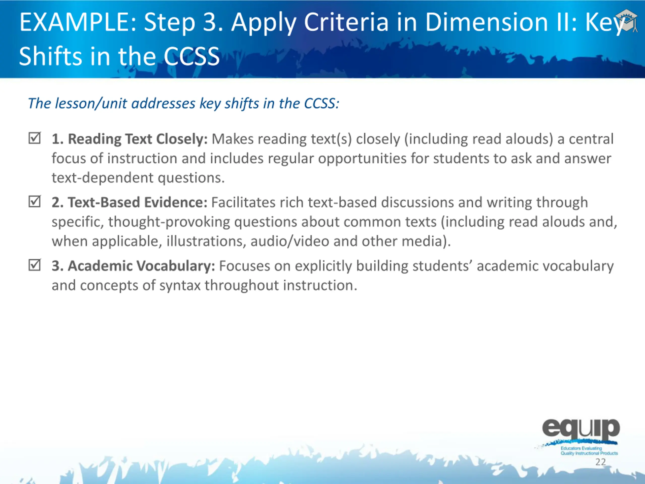 EXAMPLE: Step 3. Apply Criteria in Dimension II: Key Shifts in the CCSS The lesson/unit addresses key shifts in the CCSS: 1. Reading Text Closely: Makes reading text(s) closely (including read alouds) a central focus of instruction and includes regular opportunities for students to ask and answer text-dependent questions. 2. Text-Based Evidence: Facilitates rich text-based discussions and writing through specific, thought-provoking questions about common texts (including read alouds and, when applicable, illustrations, audio/video and other media). 3. Academic Vocabulary: Focuses on explicitly building students academic vocabulary and concepts of syntax throughout instruction. 22