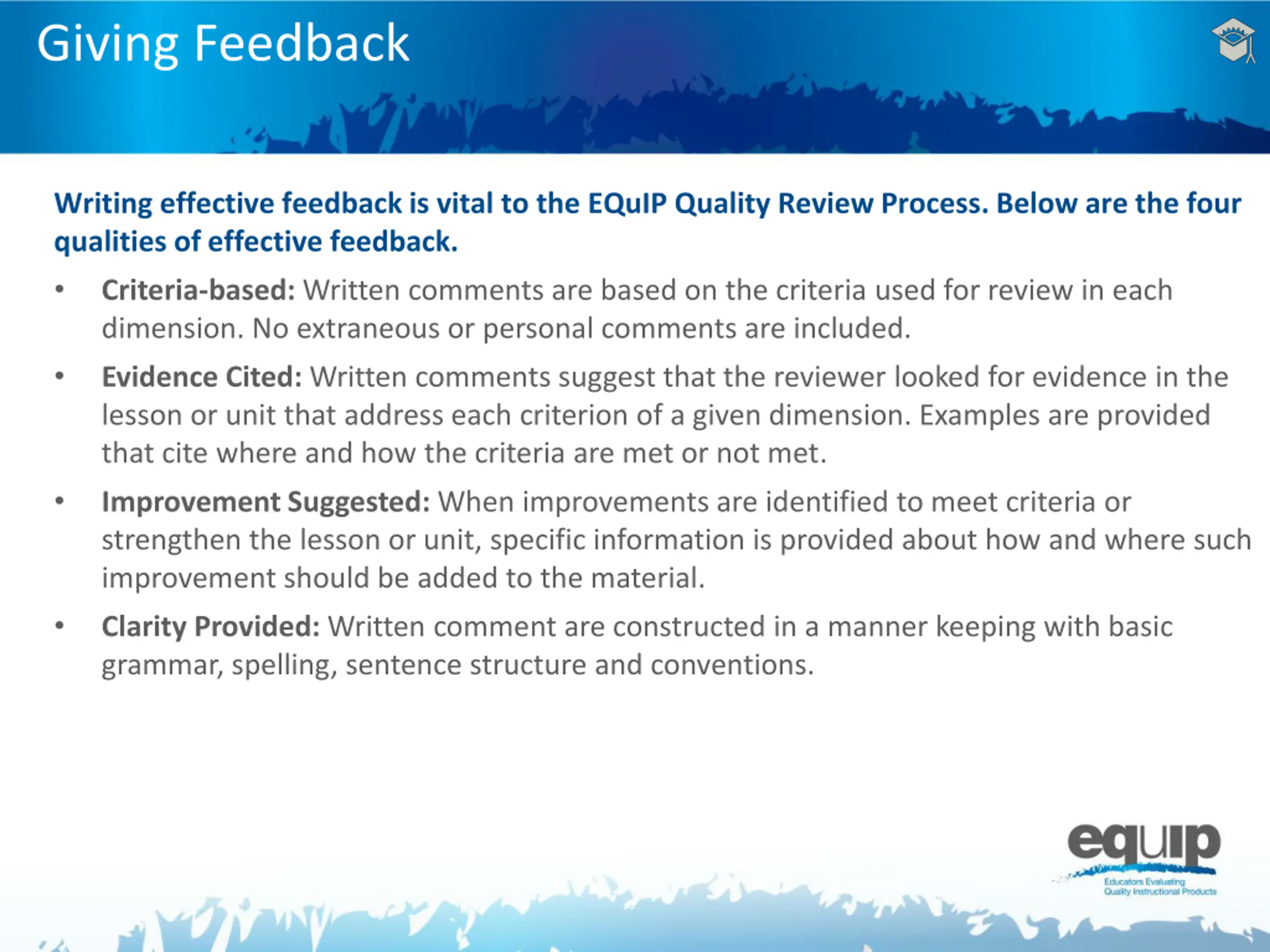 Giving Feedback Writing effective feedback is vital to the EQuIP Quality Review Process. Below are the four qualities of effective feedback. Criteria-based: Written comments are based on the criteria used for review in each dimension. No extraneous or personal comments are included. Evidence Cited: Written comments suggest that the reviewer looked for evidence in the lesson or unit that address each criterion of a given dimension. Examples are provided that cite where and how the criteria are met or not met. Improvement Suggested: When improvements are identified to meet criteria or strengthen the lesson or unit, specific information is provided about how and where such improvement should be added to the material. Clarity Provided: Written comment are constructed in a manner keeping with basic grammar, spelling, sentence structure and conventions.