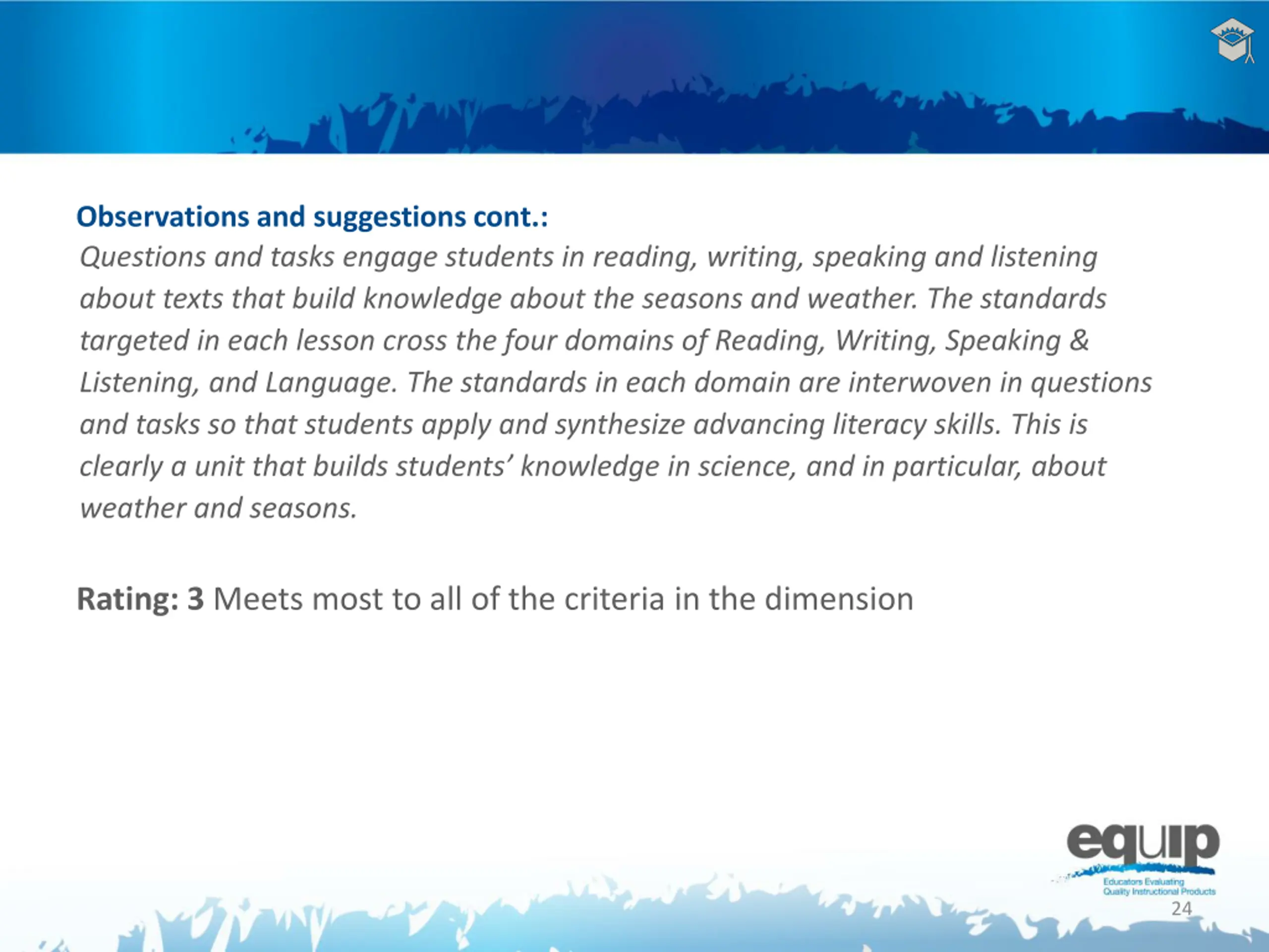 Observations and suggestions cont.: Questions and tasks engage students in reading, writing, speaking and listening about texts that build knowledge about the seasons and weather. The standards targeted in each lesson cross the four domains of Reading, Writing, Speaking & Listening, and Language. The standards in each domain are interwoven in questions and tasks so that students apply and synthesize advancing literacy skills. This is clearly a unit that builds students knowledge in science, and in particular, about weather and seasons. Rating: 3 Meets most to all of the criteria in the dimension 24