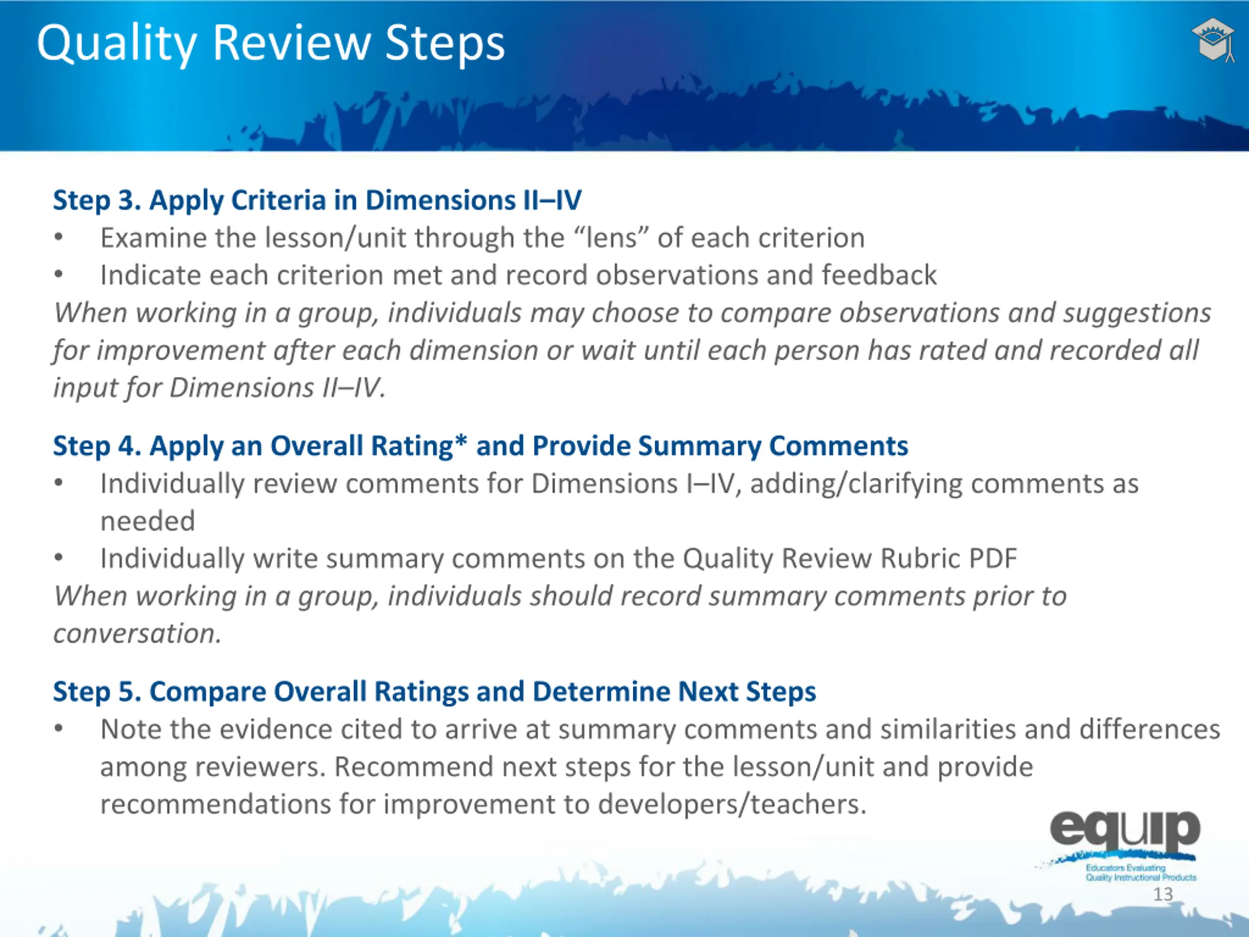 Quality Review Steps Step 1. Review Materials Record the grade and title of the lesson/unit on the Quality Review Rubric PDF Scan to see what the lesson/unit contains and how it is organized Read key materials related to instruction, assessment and teacher guidance Study and measure the text(s) that serves as the centerpiece for the lesson/unit, analyzing text complexity, quality, scope and relationship to instruction Step 2. Apply Criteria in Dimension I: Alignmentto the Depth of the CCSS Identify the grade-level CCSS that the lesson/unit targets Closely examine the materials through the lens of each criterion Indicate each criterion for which clear and substantial evidence is found Record input on specific improvements needed to meet criteria or strengthen alignment Compare observations and suggestions for improvement After applying criteria in Dimension I, when working in a group, individuals may choose to compare observations and suggestions for improvement after each dimension or wait until each person has rated and recorded all input for Dimensions II IV. 12