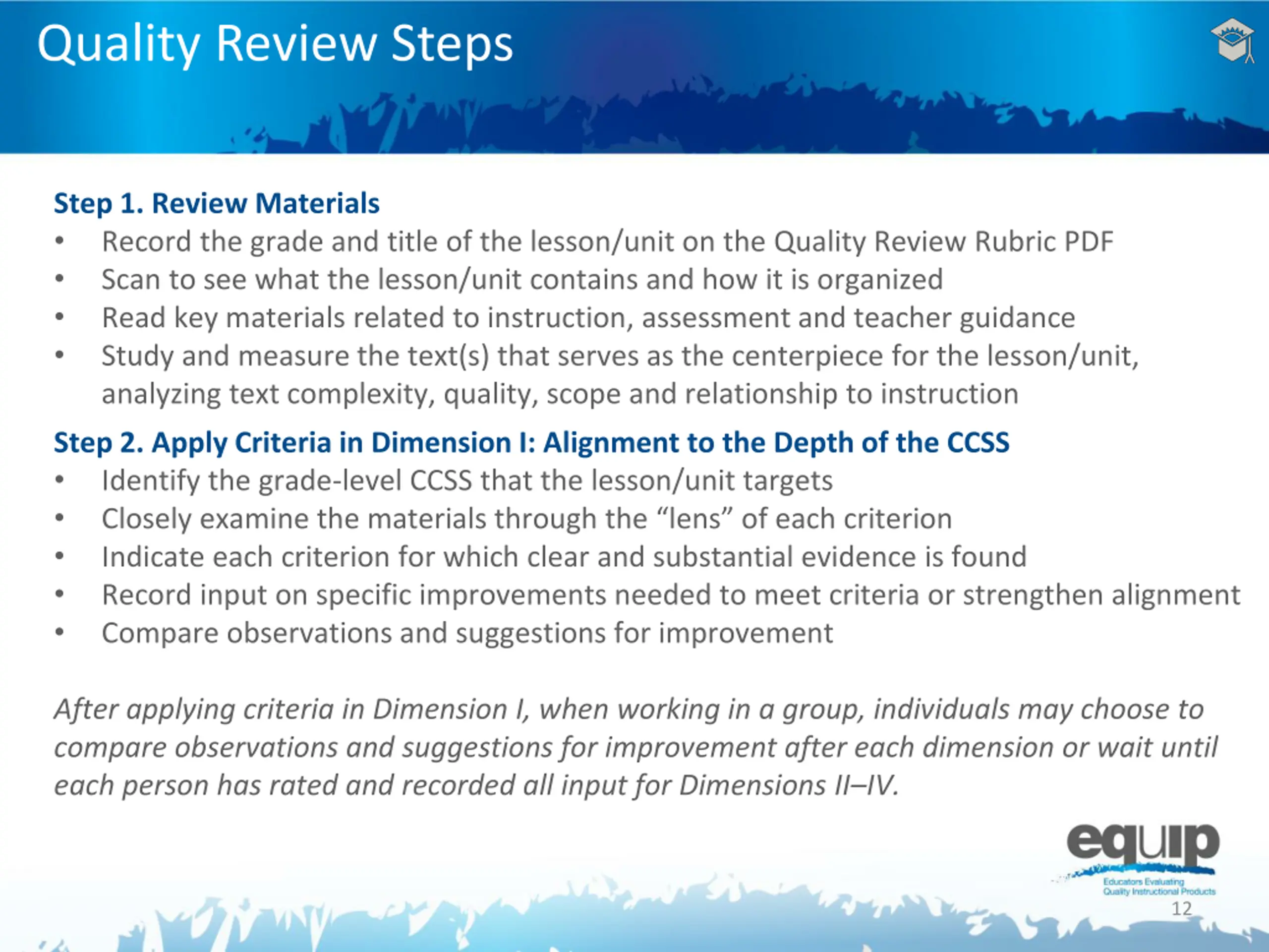 EQuIP Quality Review: Process & Dimensions EQuIP Quality Review Process The EQuIP quality review process is a collegial process that centers on the use of criteria-based rubrics for English language arts (ELA)/literacy and mathematics. The criteria are organized into four dimensions. The Four Dimensions 1. Alignment to the Depth of the CCSS; 2. Key Shifts in the CCSS; 3. Instructional Supports; and 4. Assessment. As educators examine instructional materials against the criteria in each dimension, they are able to use common standards for quality and generate evidence-based commentary and ratings on the quality and alignment of materials. 4