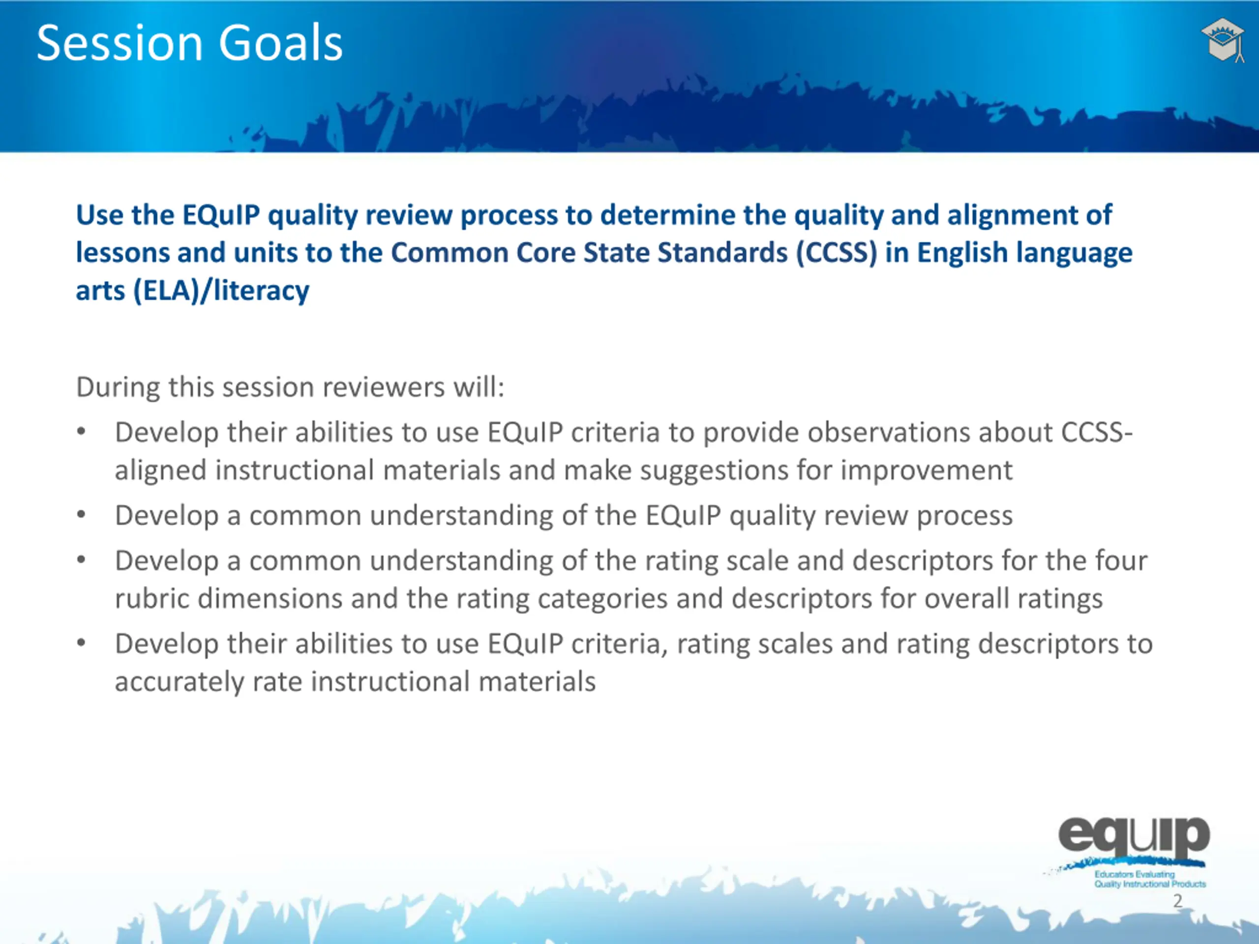 Session Goals Use the EQuIP quality review process to determine the quality and alignment of lessons and units to the Common Core State Standards (CCSS) in English language arts (ELA)/literacy During this session reviewers will: Develop their abilities to use EQuIP criteria to provide observations about CCSS- aligned instructional materials and make suggestions for improvement Develop a common understanding of the EQuIP quality review process Develop a common understanding of the rating scale and descriptors for the four rubric dimensions and the rating categories and descriptors for overall ratings Develop their abilities to use EQuIP criteria, rating scales and rating descriptors to accurately rate instructional materials 2