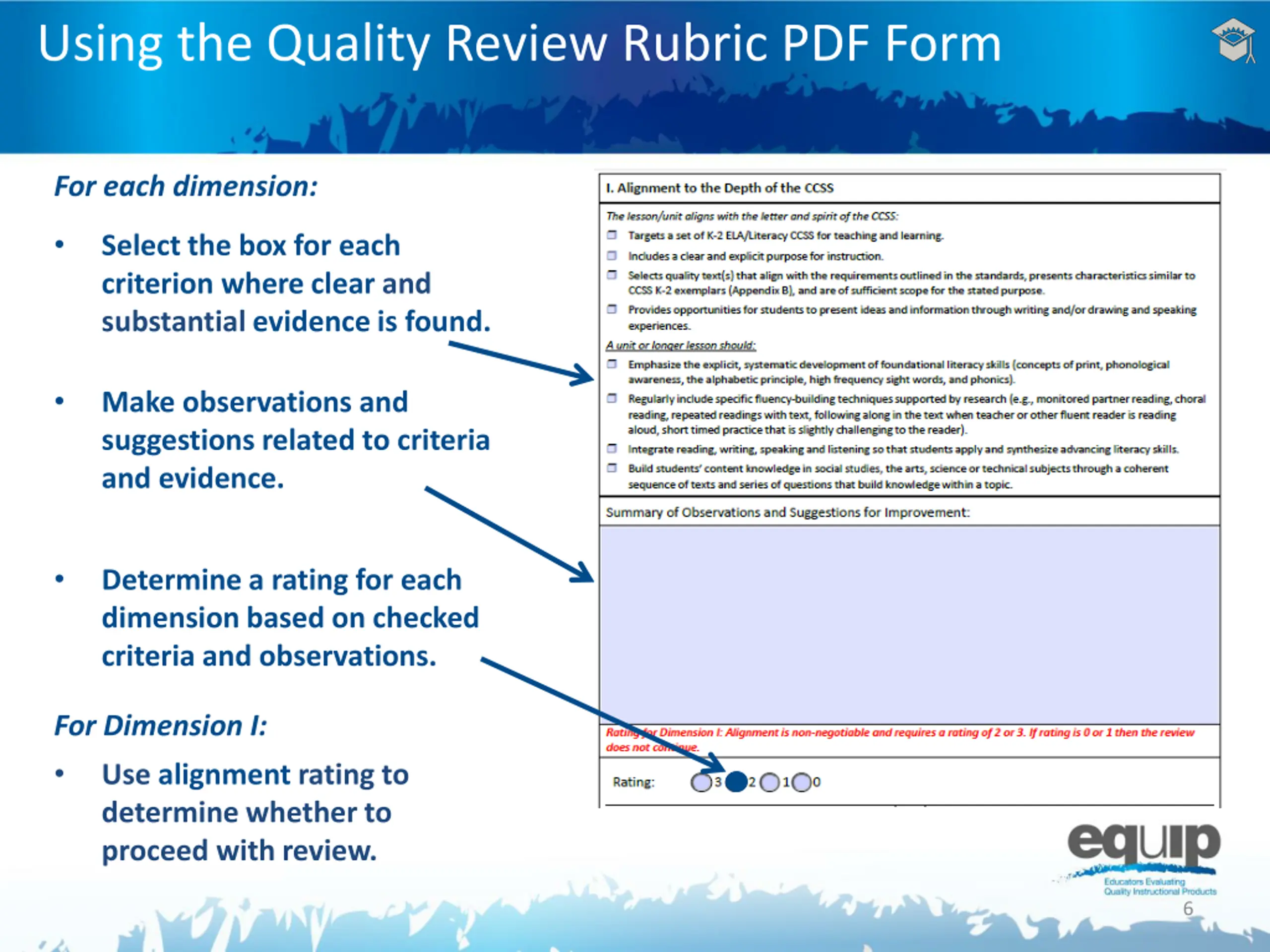Using the Quality Review Rubric PDF Form For each dimension: Select the box for each criterion where clear and substantial evidence is found. Make observations and suggestions related to criteria and evidence. Determine a rating for each dimension based on checked criteria and observations. For Dimension I: Use alignment rating to determine whether to proceed with review. 6
