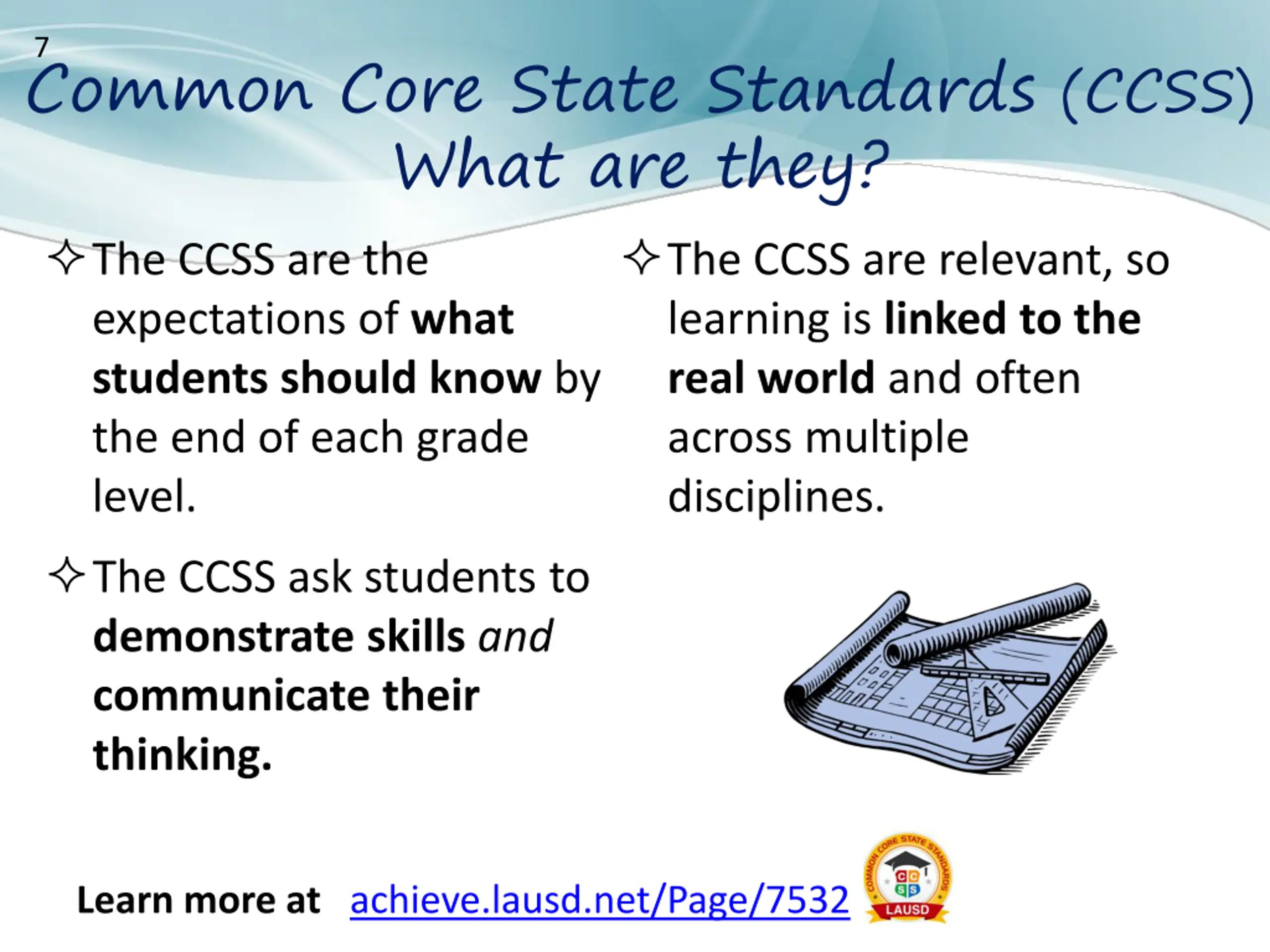 Common Core State Standards (CCSS) What are they? The CCSS are the expectations of what students should know by the end of each grade level. The CCSS ask students to demonstrateskillsand communicatetheir thinking. 7 The CCSS are relevant, so learning is linkedto the real world and often across multiple disciplines. Learn more at achieve.lausd.net/Page/7532