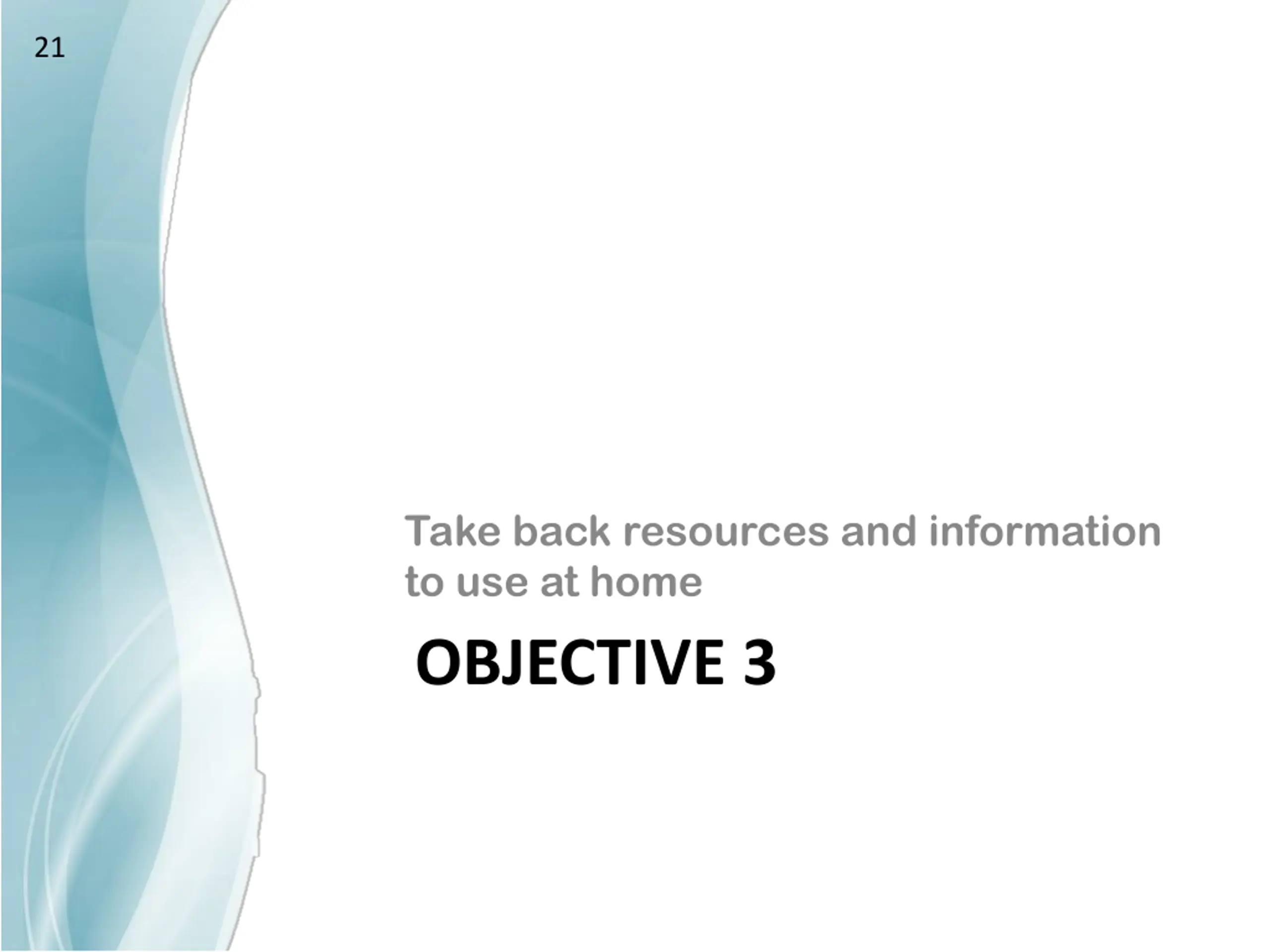 21 Take back resources and information to use at home OBJECTIVE 3