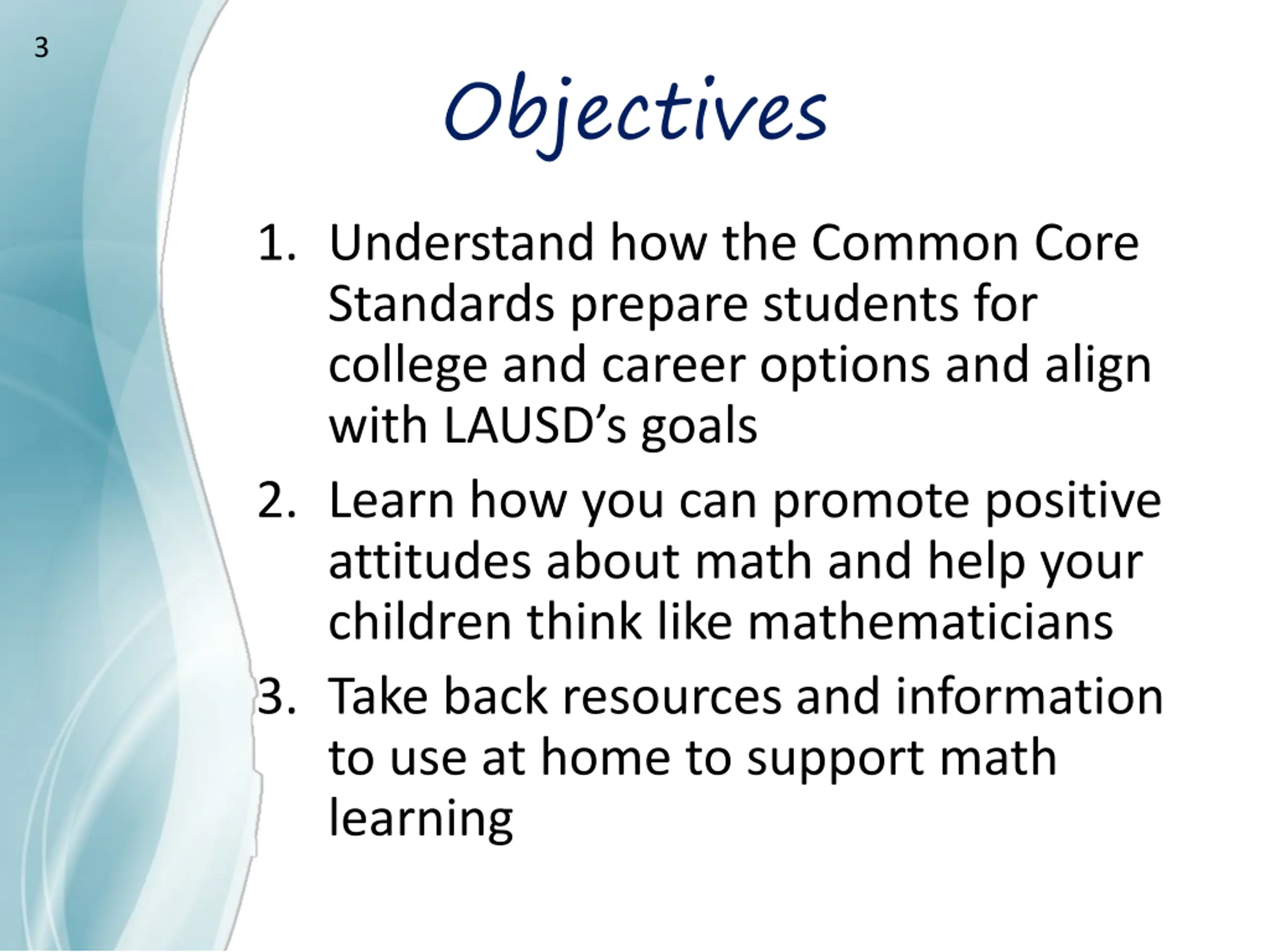 23 Objectives Understand how the Common Core Standards prepare students for college and career options and align with LAUSD s goals Learn how you can promote positive attitudes about math and help your children think like mathematicians Take back resources and information to use at home