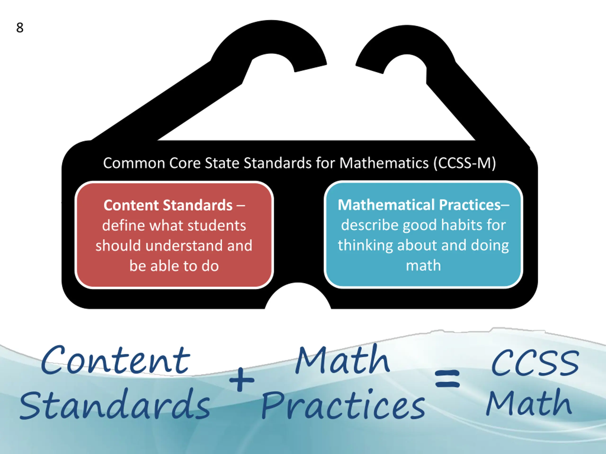 8 Common Core State Standards for Mathematics (CCSS-M) Mathematical Practices describe good habits for thinking about and doing math Content Standards define what students should understand and be able to do Content Standards Math Practices + CCSS Math =