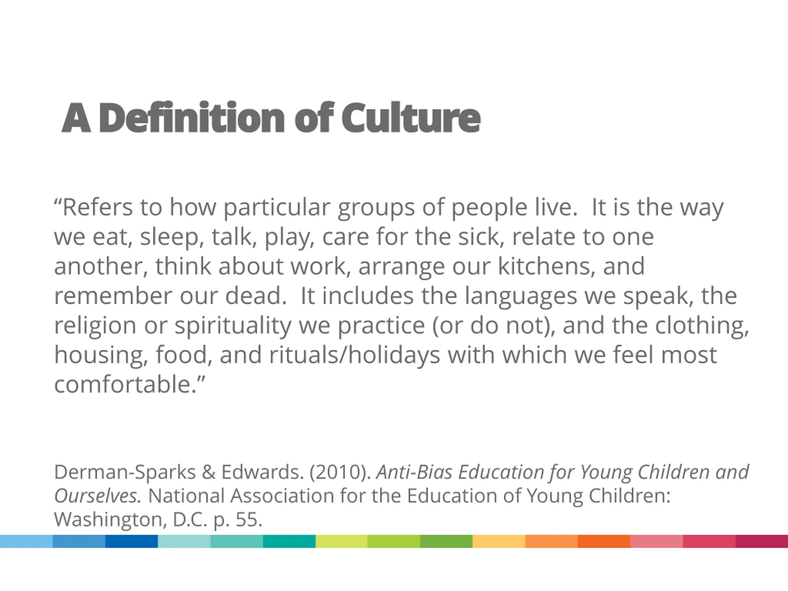 A Definition of Culture A Definition of Culture Refers to how particular groups of people live. It is the way we eat, sleep, talk, play, care for the sick, relate to one another, think about work, arrange our kitchens, and remember our dead. It includes the languages we speak, the religion or spirituality we practice (or do not), and the clothing, housing, food, and rituals/holidays with which we feel most comfortable. Derman-Sparks & Edwards. (2010). Anti-Bias Education for Young Children and Ourselves. National Association for the Education of Young Children: Washington, D.C. p. 55.