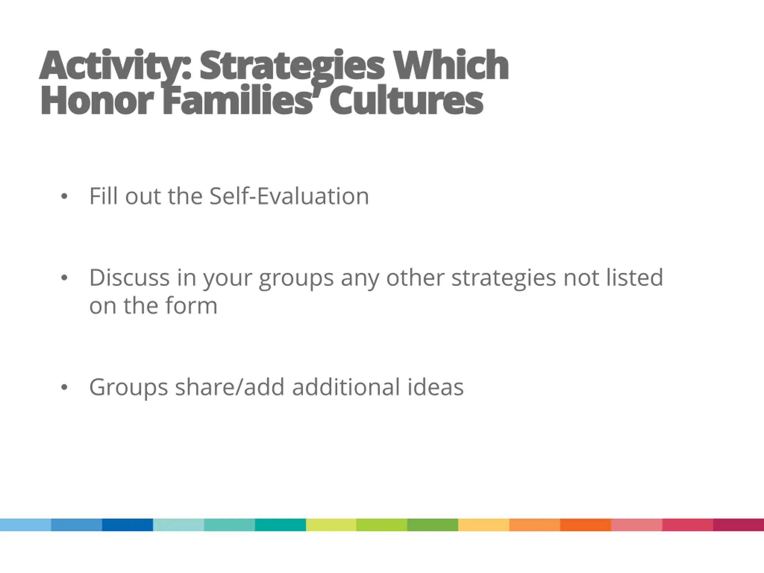 Activity: Strategies Which Activity: Strategies Which Honor Families Cultures Honor Families Cultures Fill out the Self-Evaluation Discuss in your groups any other strategies not listed on the form Groups share/add additional ideas