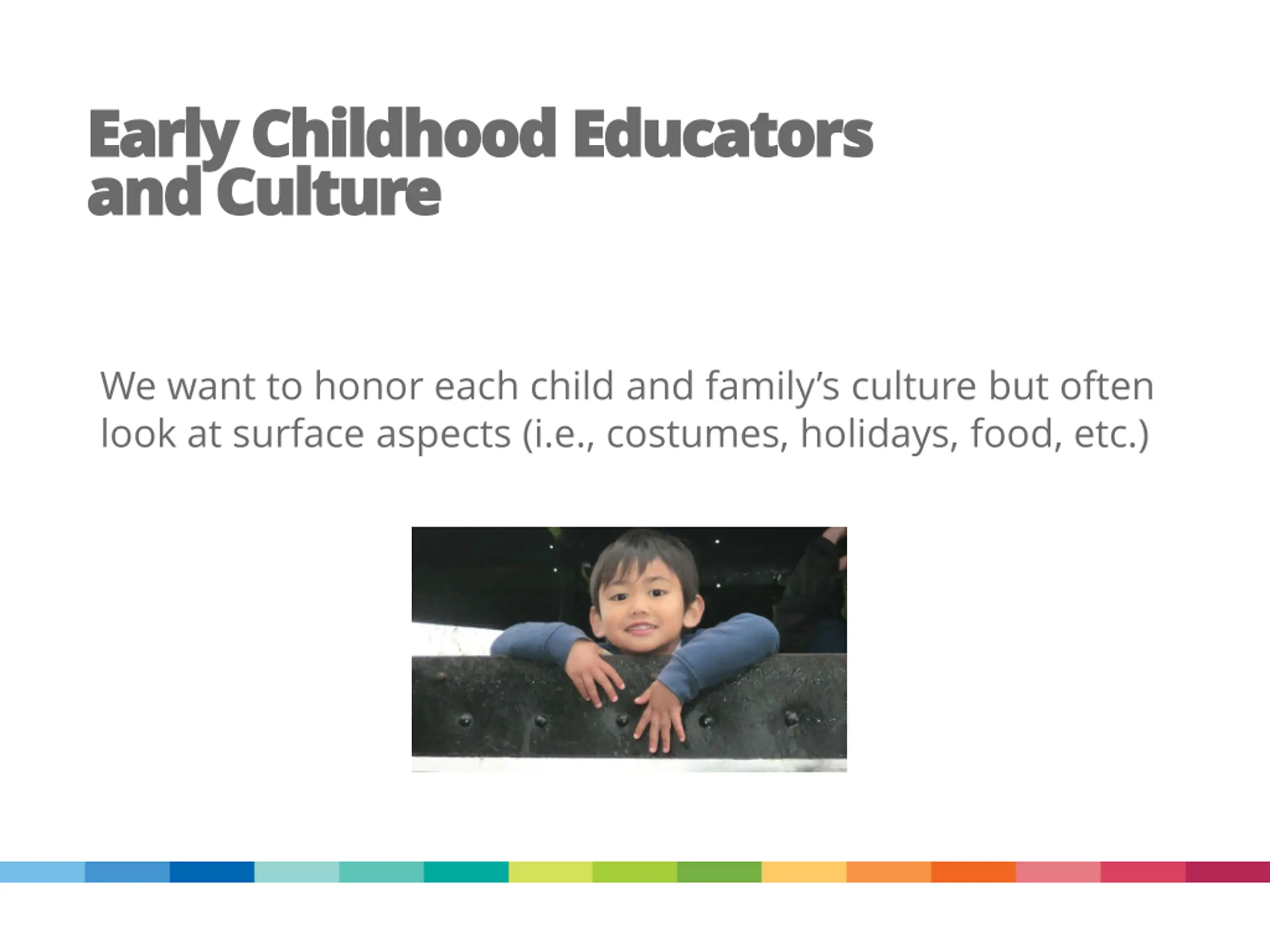 Early Childhood Educators Early Childhood Educators and Culture and Culture We want to honor each child and family s culture but often look at surface aspects (i.e., costumes, holidays, food, etc.)