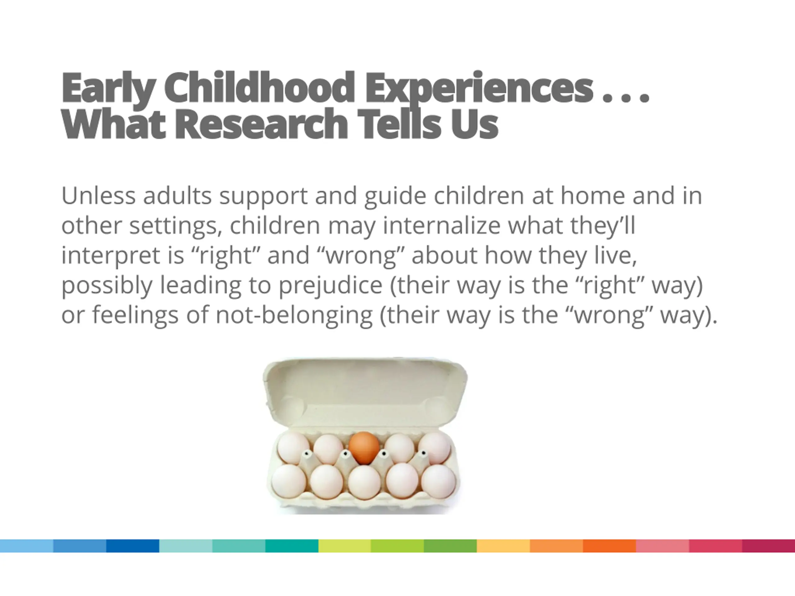 Early Childhood Experiences . . . Early Childhood Experiences . . . What Research Tells Us What Research Tells Us Unless adults support and guide children at home and in other settings, children may internalize what they ll interpret is right and wrong about how they live, possibly leading to prejudice (their way is the right way) or feelings of not-belonging (their way is the wrong way).