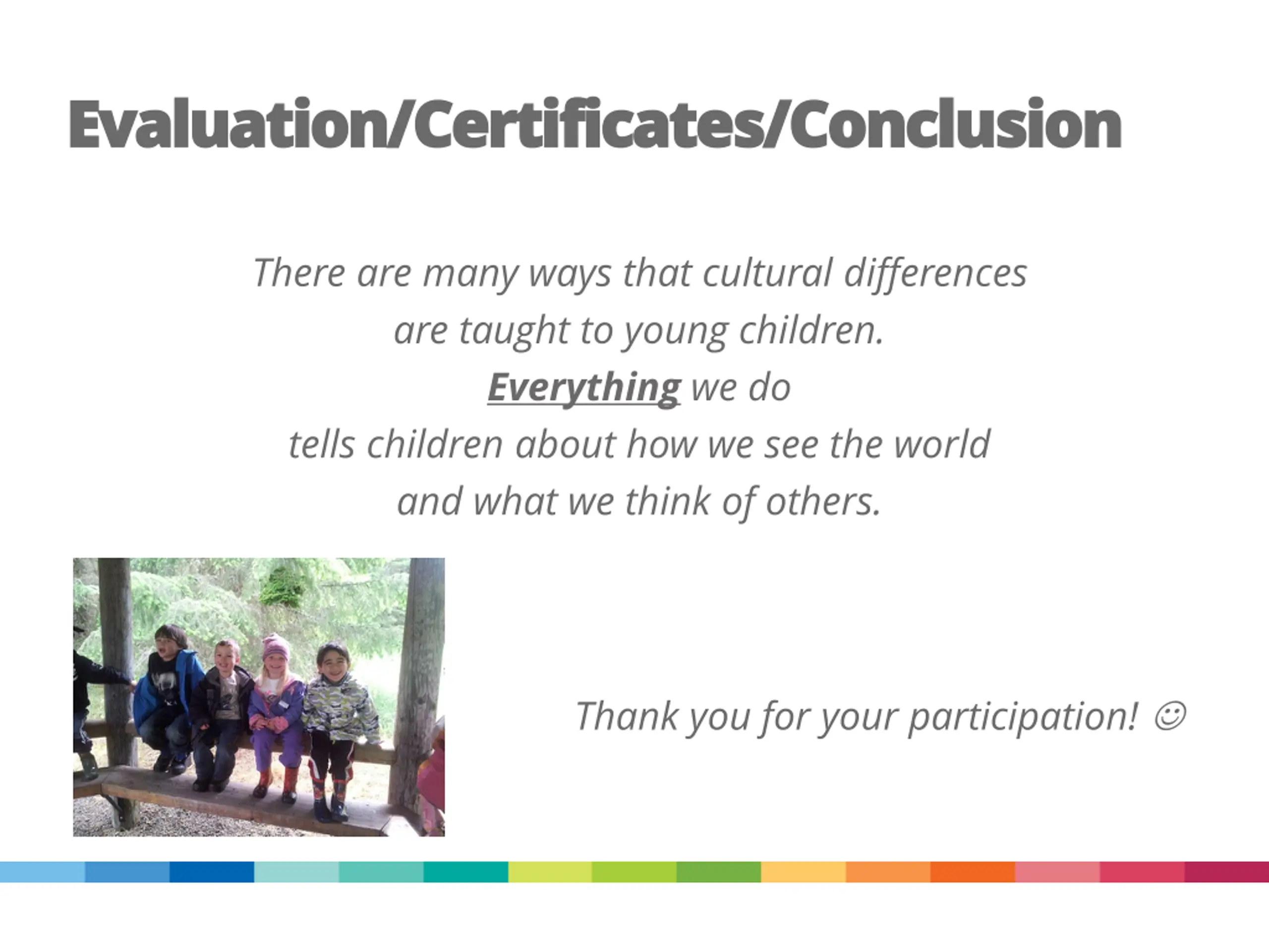 Evaluation/Certificates/Conclusion Evaluation/Certificates/Conclusion There are many ways that cultural differences are taught to young children. Everything we do tells children about how we see the world and what we think of others. Thank you for your participation!